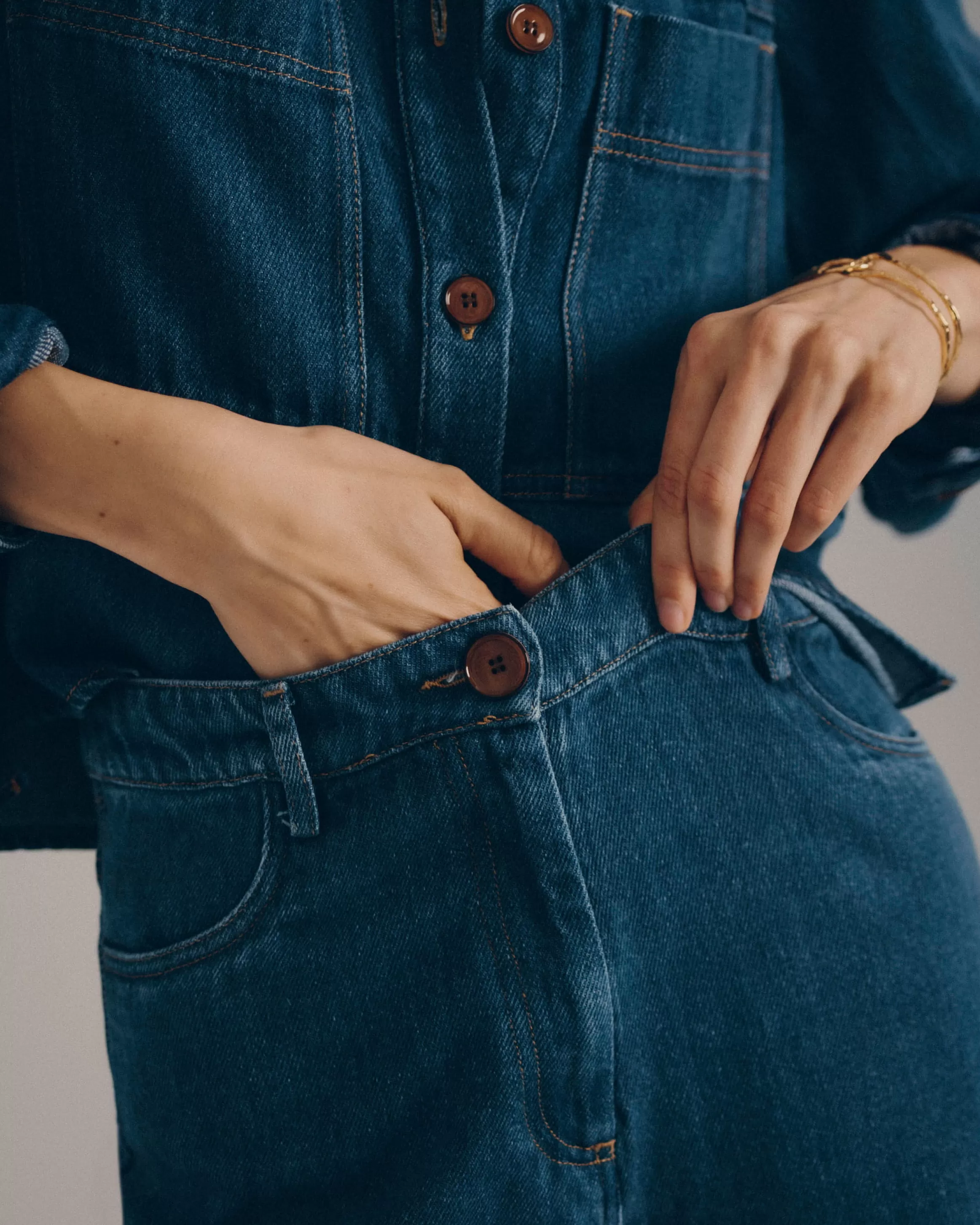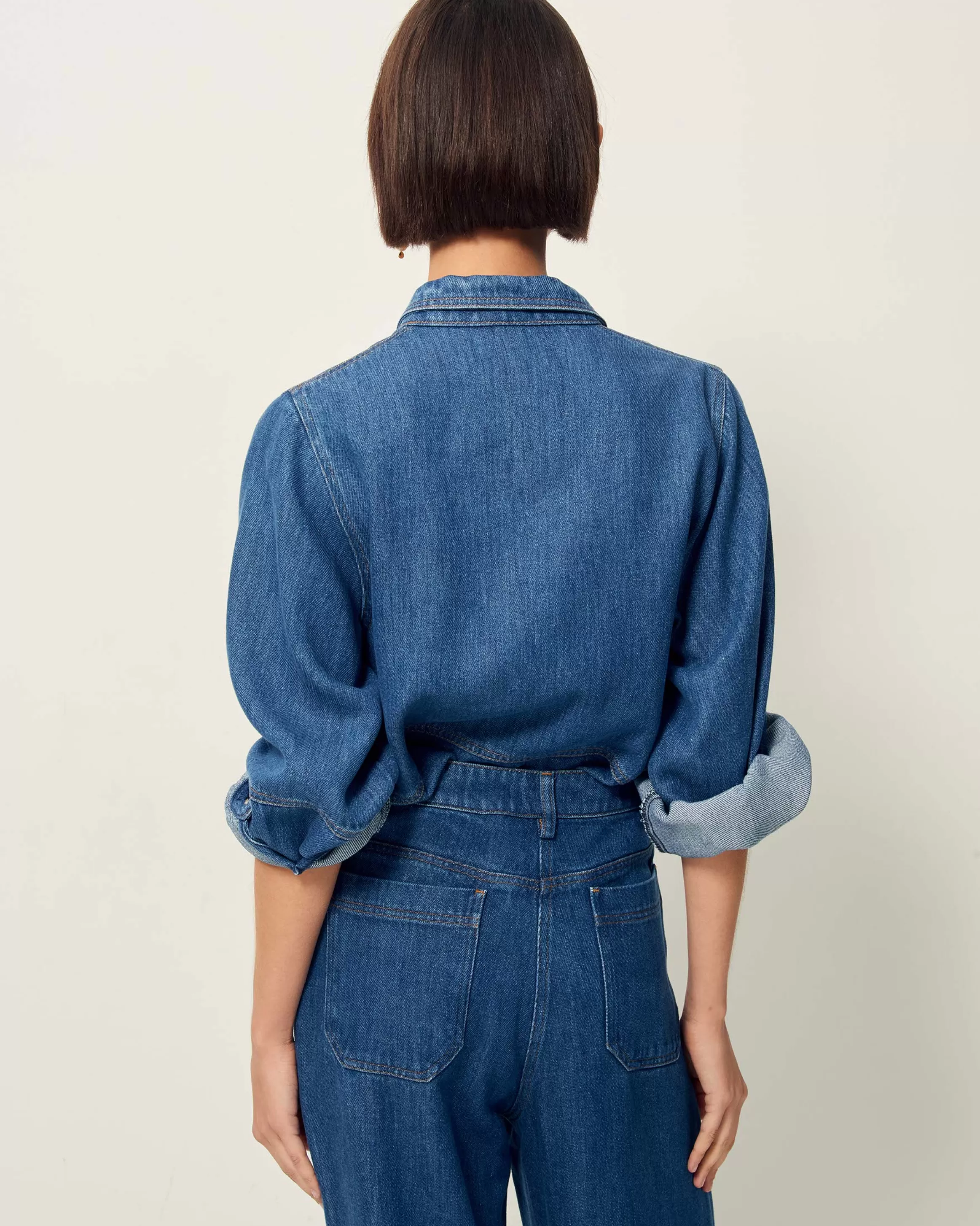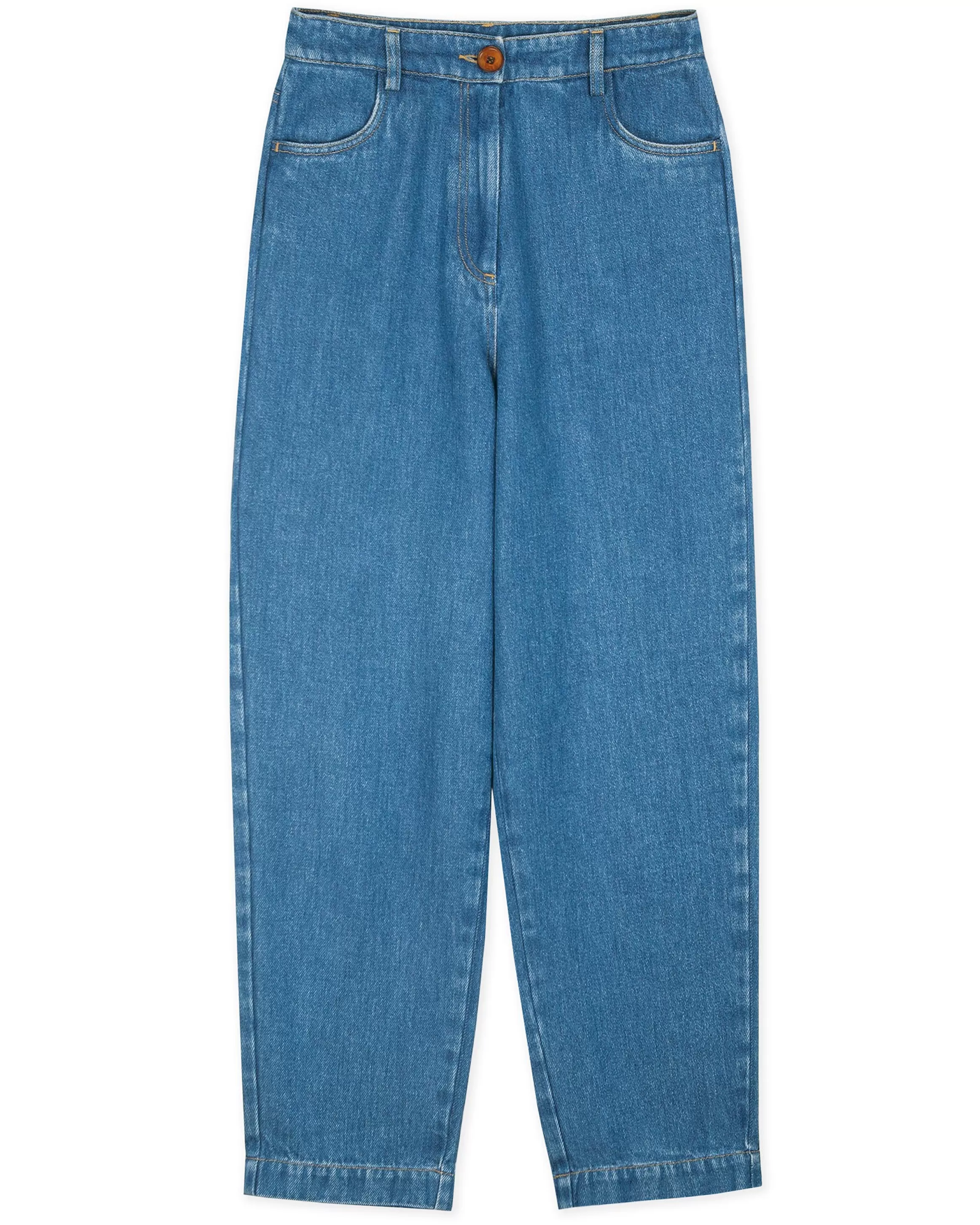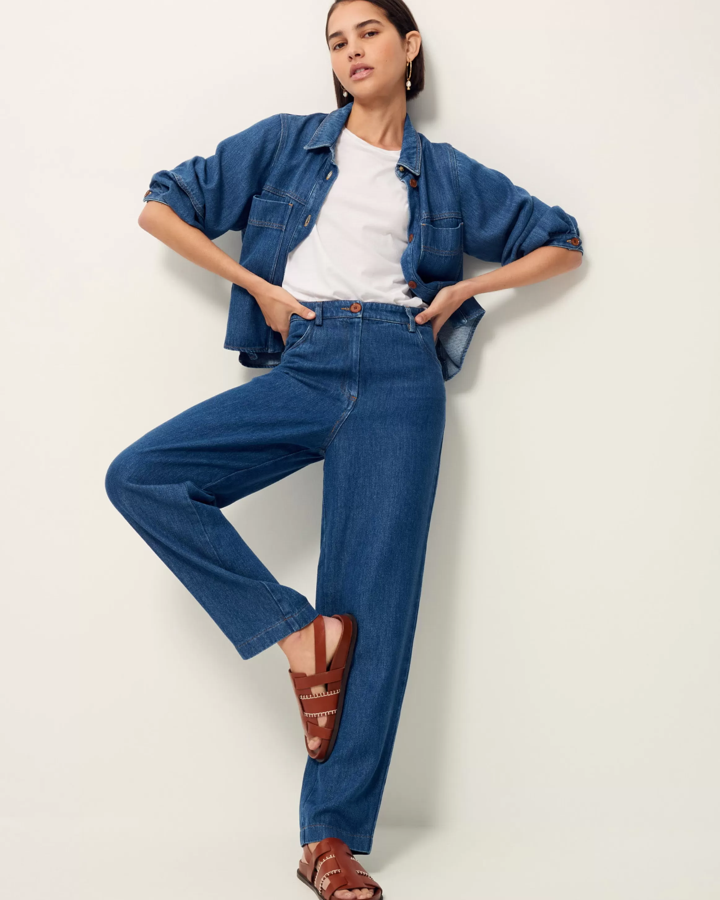 Pantalon taille haute en denim fluide stonewashé tissé en Espagne.