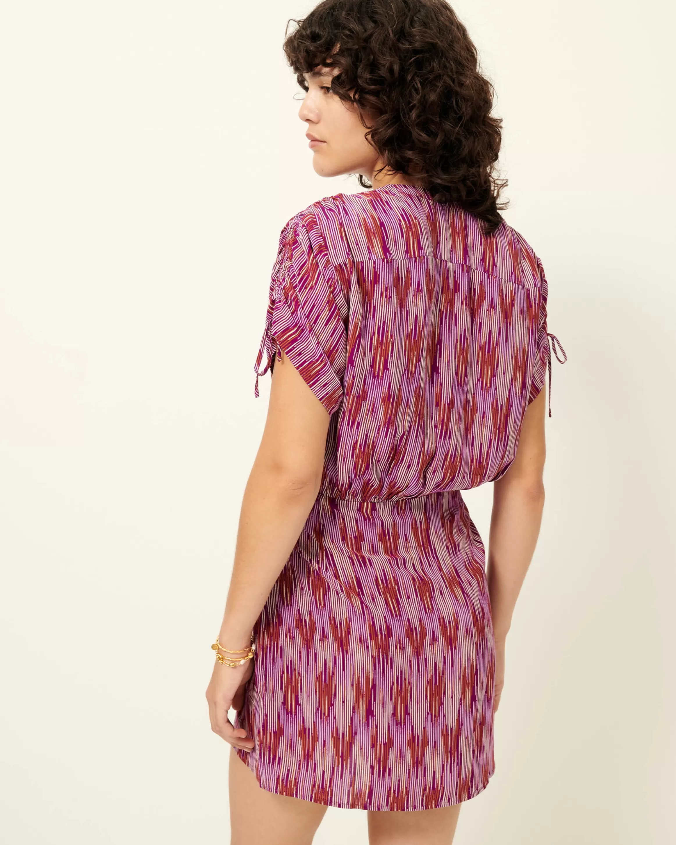 Robe courte avec liens et fronces aux épaules en toile de viscose fluide et aérienne imprimée, motif exclusif Sessùn.
