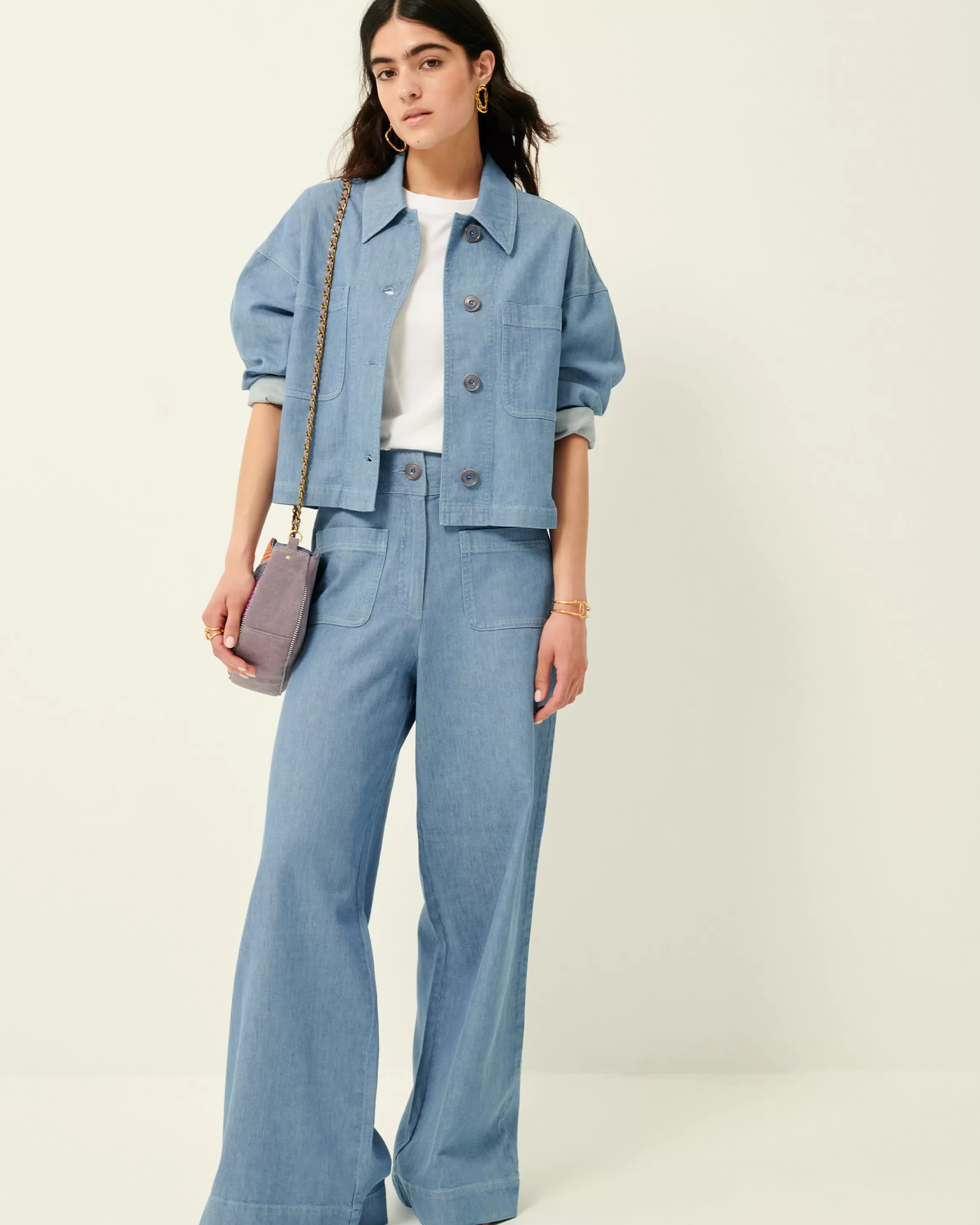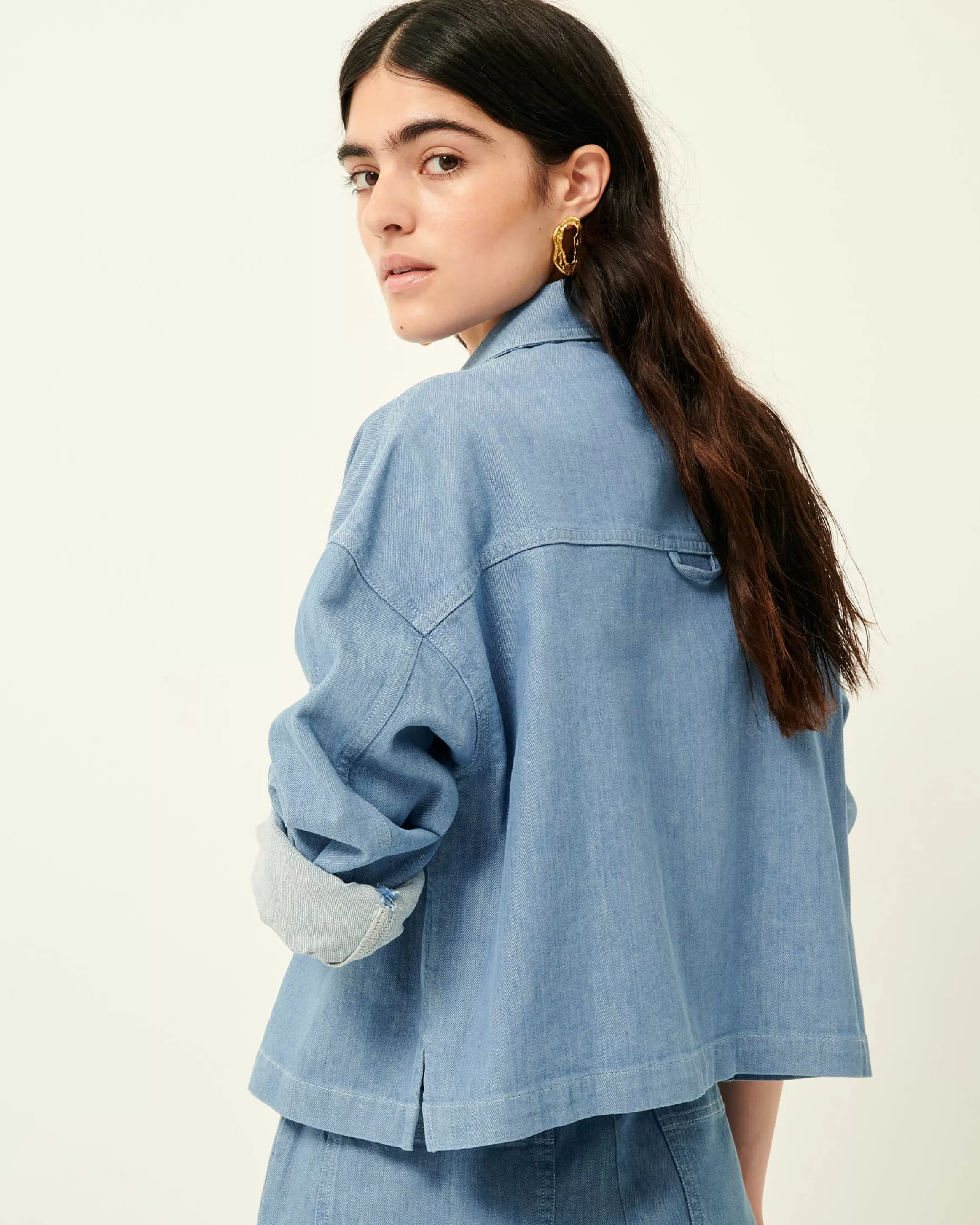 Veste légère à poches plaquées en sergé chambray de coton / lin tissé en Espagne.Natalia mesure 1m70 et porte du S…
