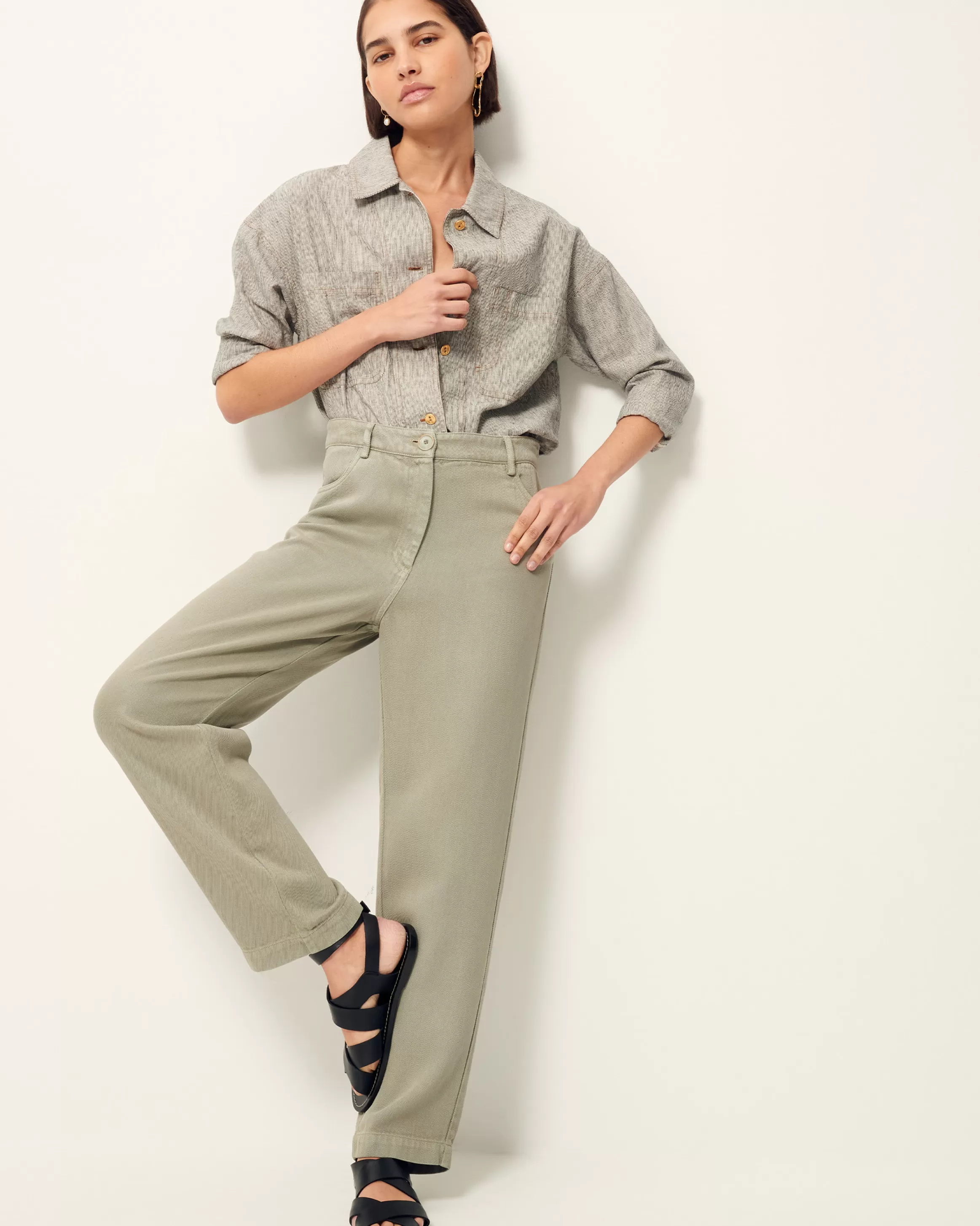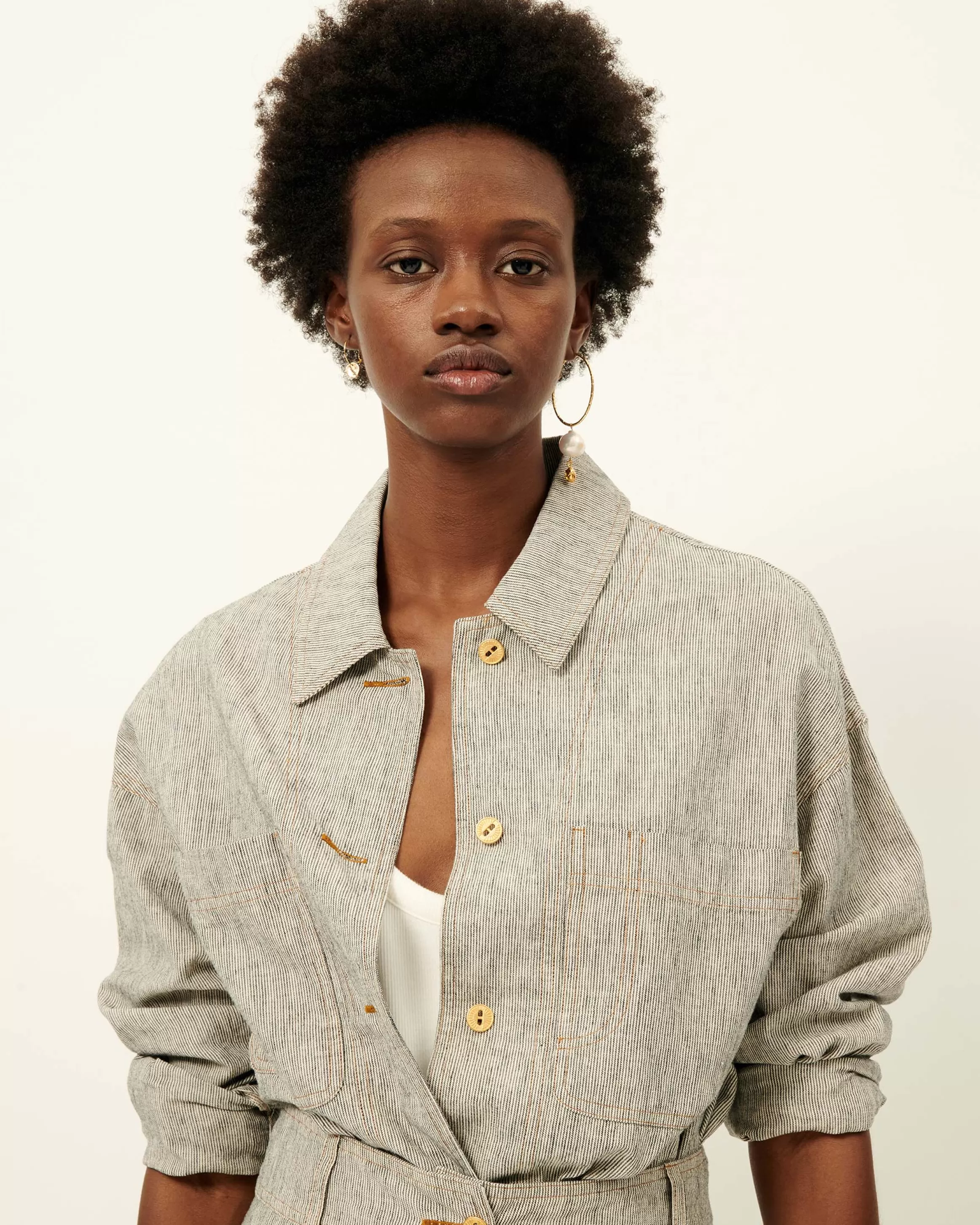 Veste légère à poches plaquées en toile armurée lin coton rayée bicolore de fil flammé tissée en Espagne.Mariam …
