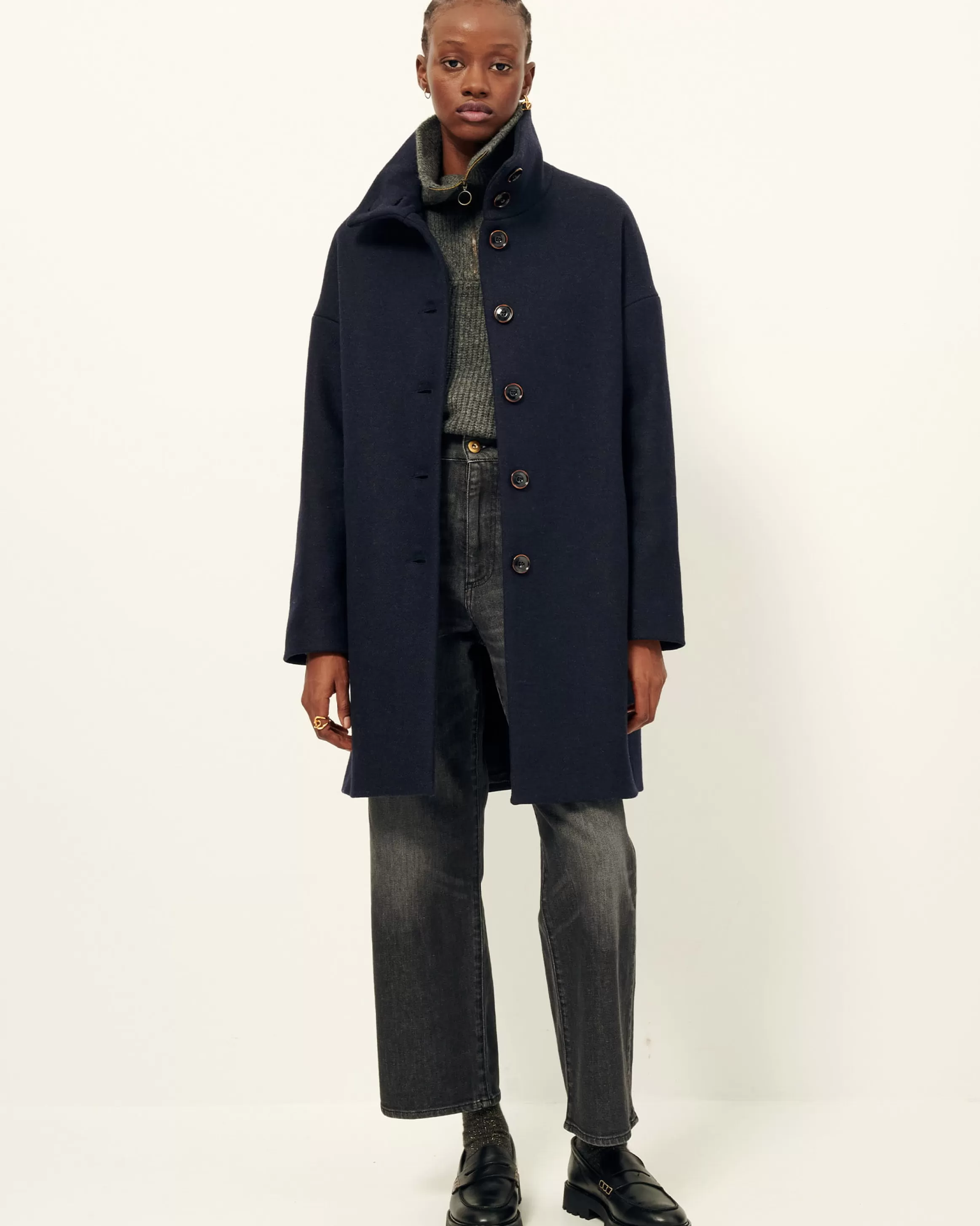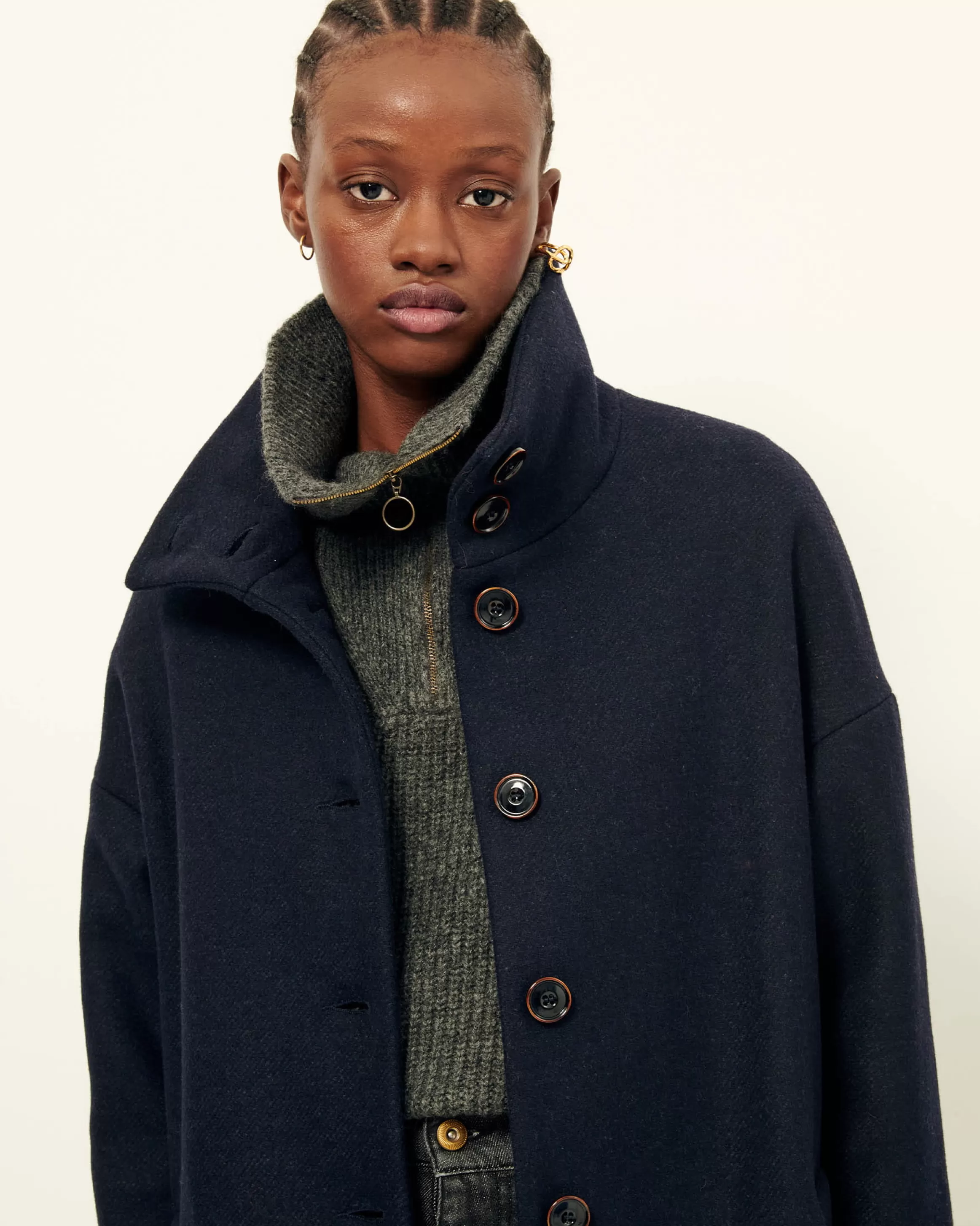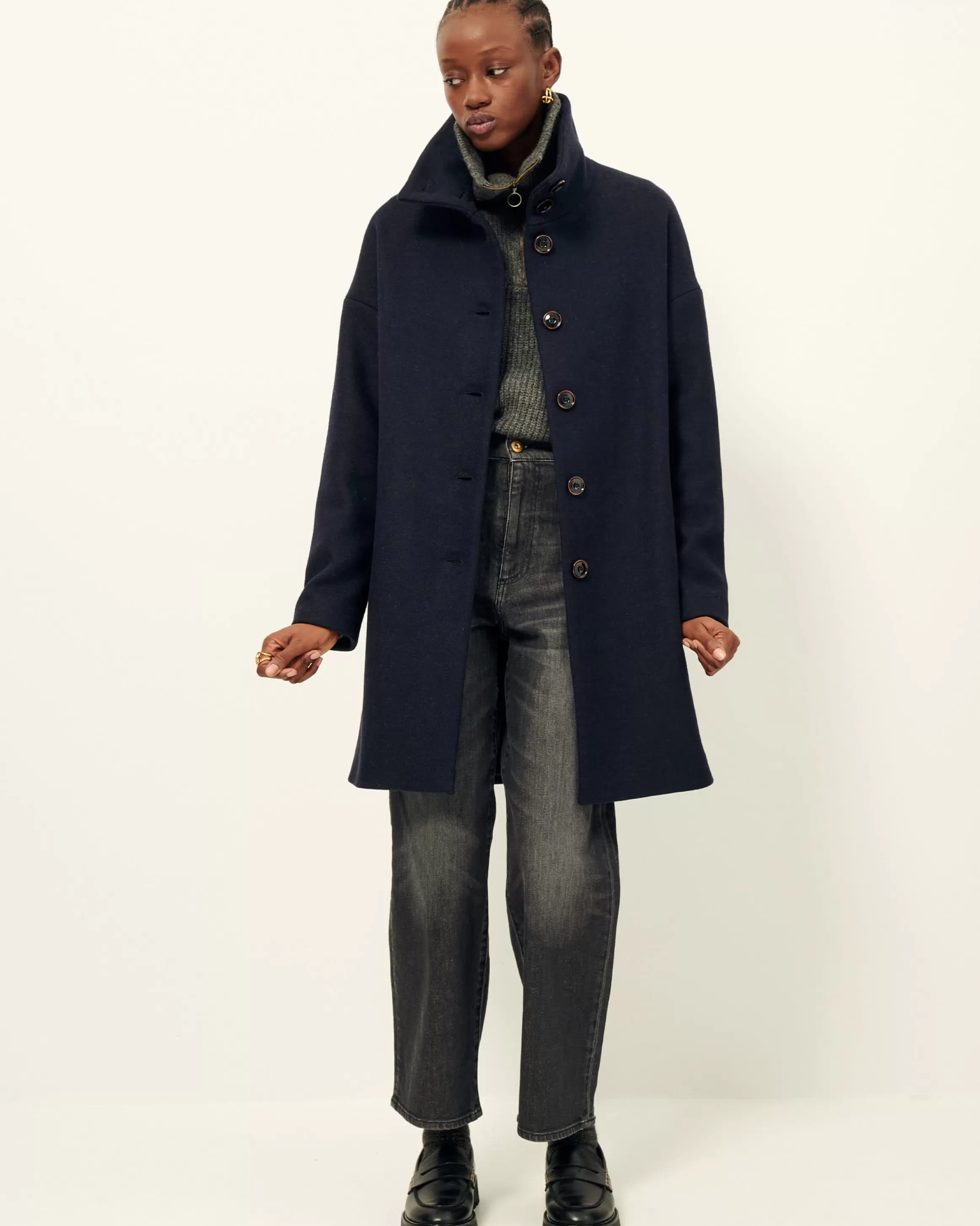 Manteau droit mi long à col montant en double tissage armuré chiné tissé en Italie.