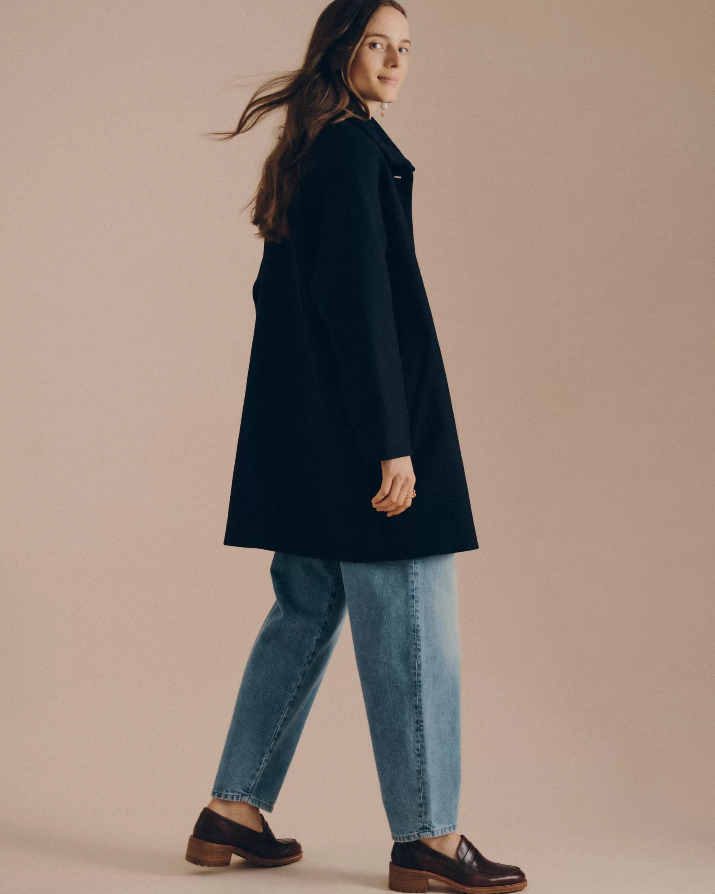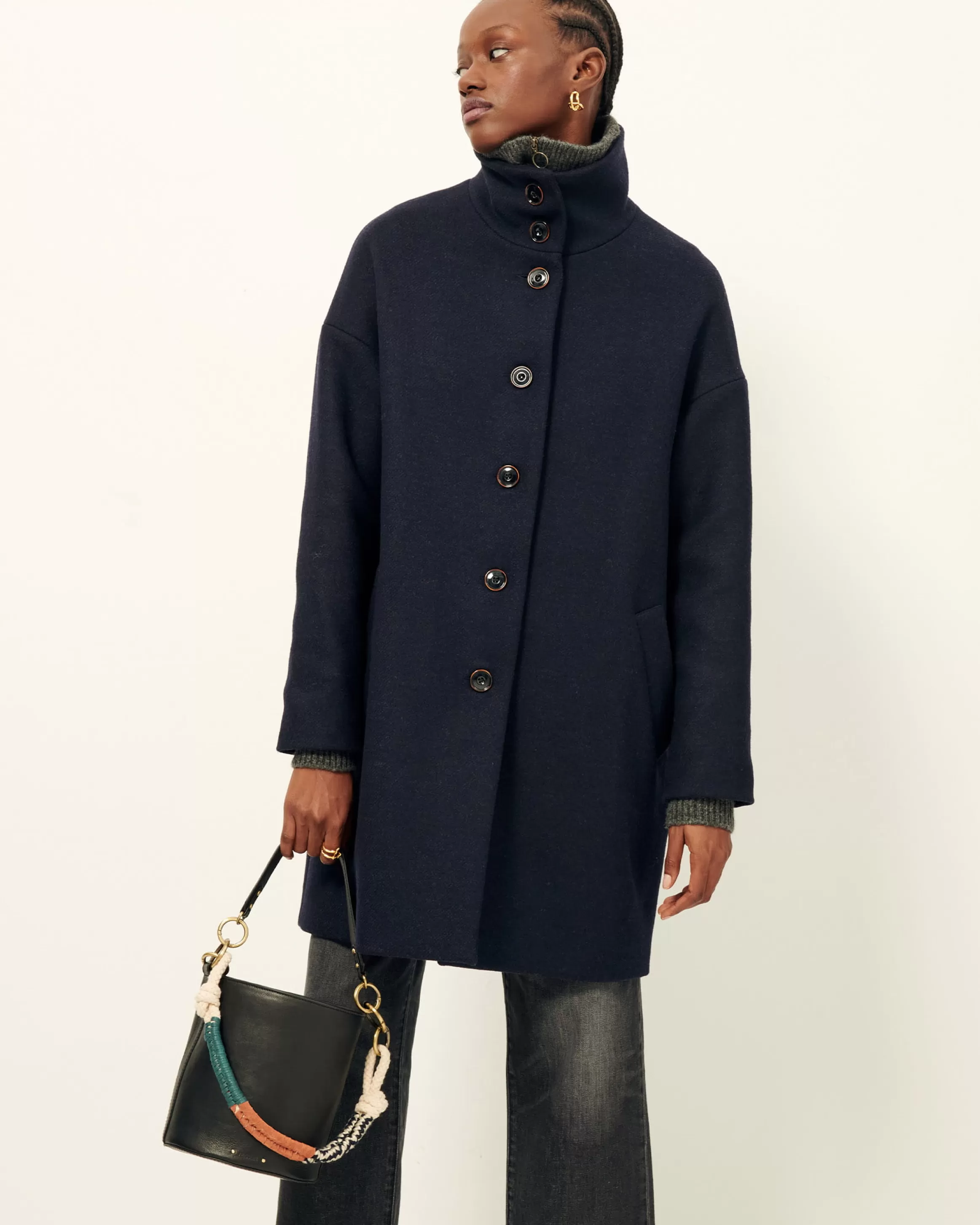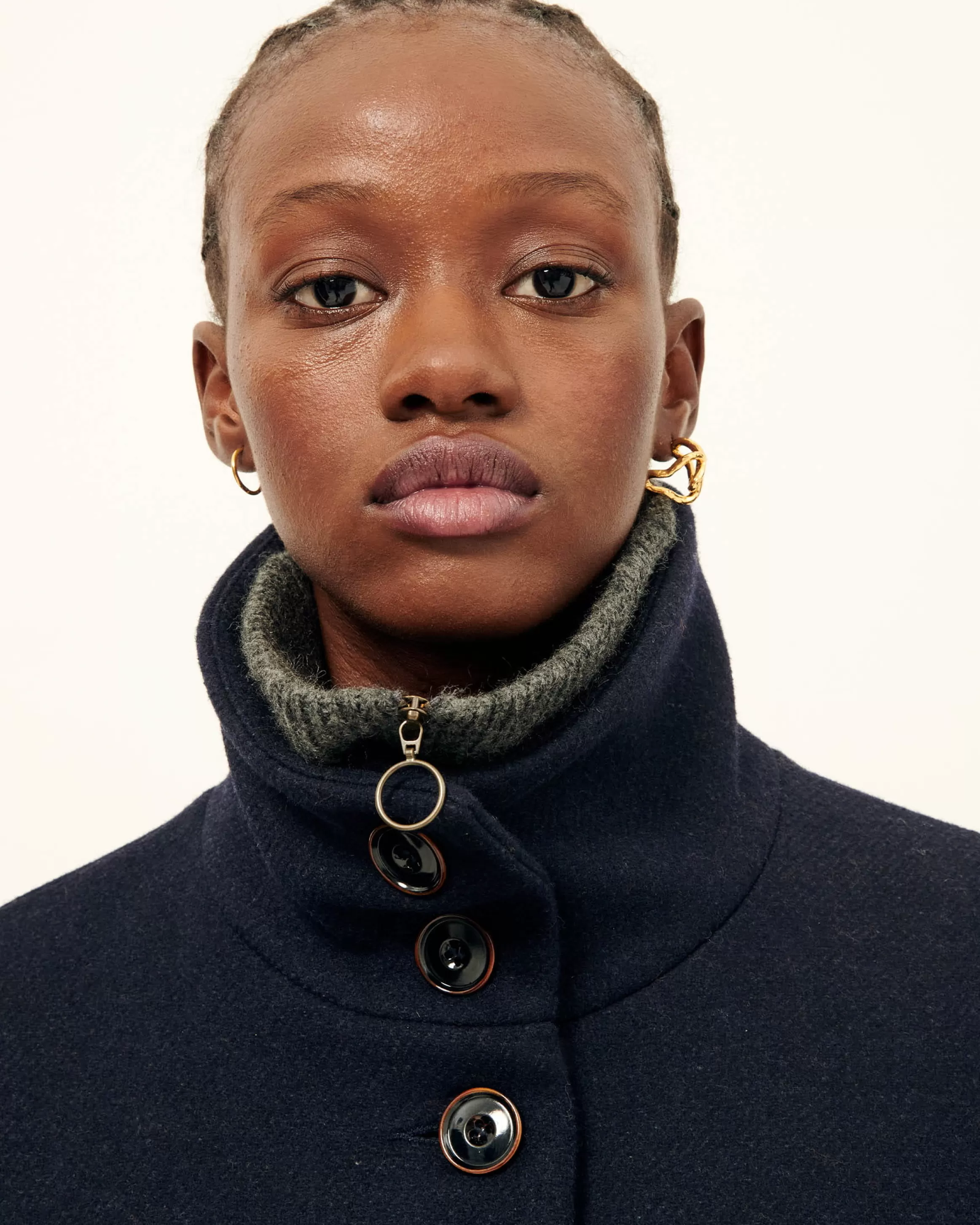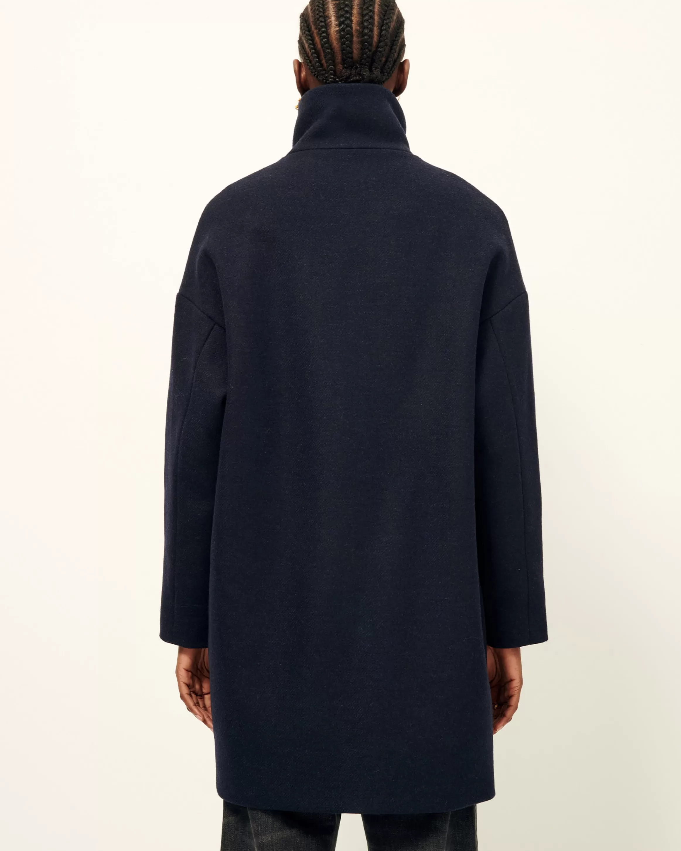 Manteau droit mi long à col montant en double tissage armuré chiné tissé en Italie.