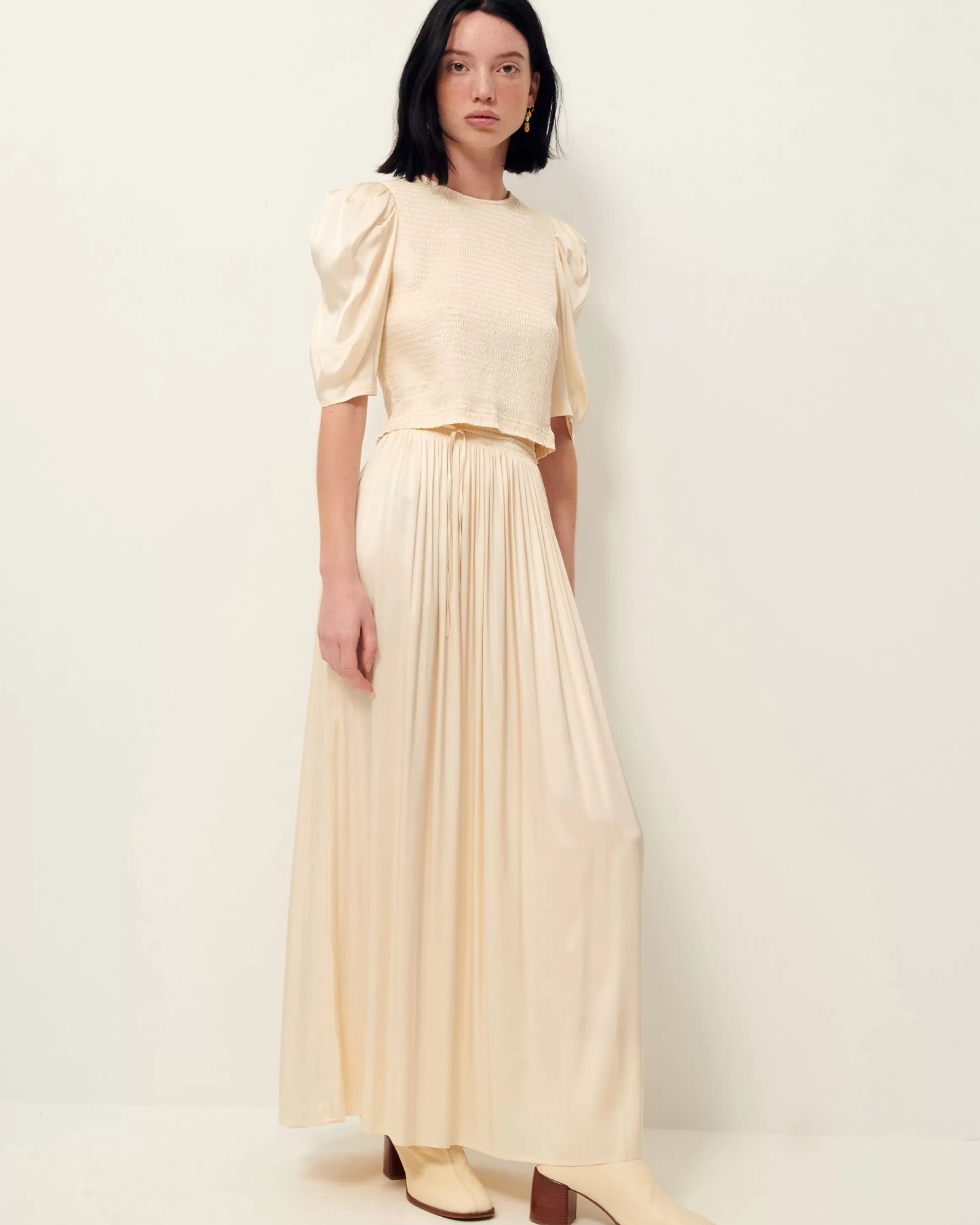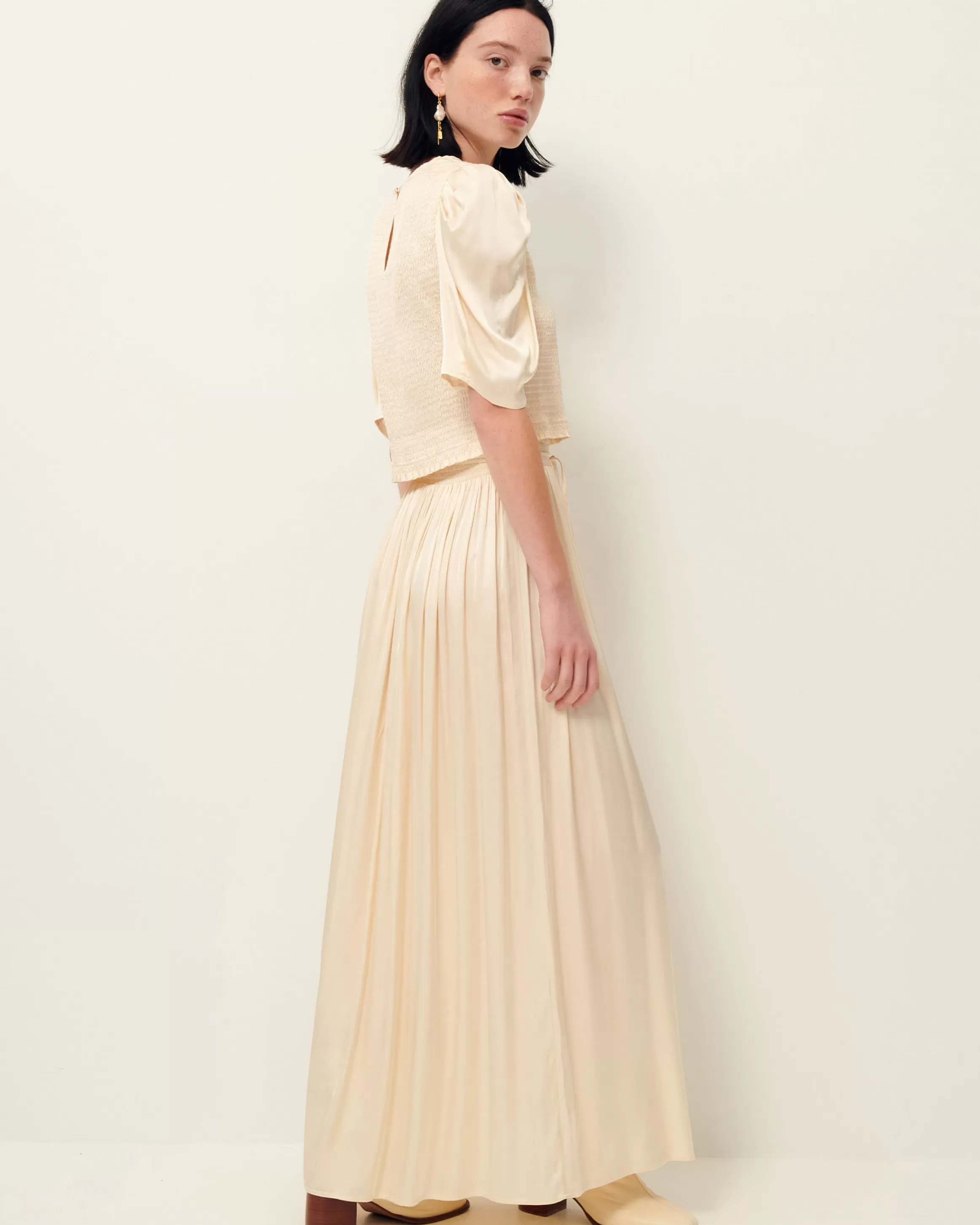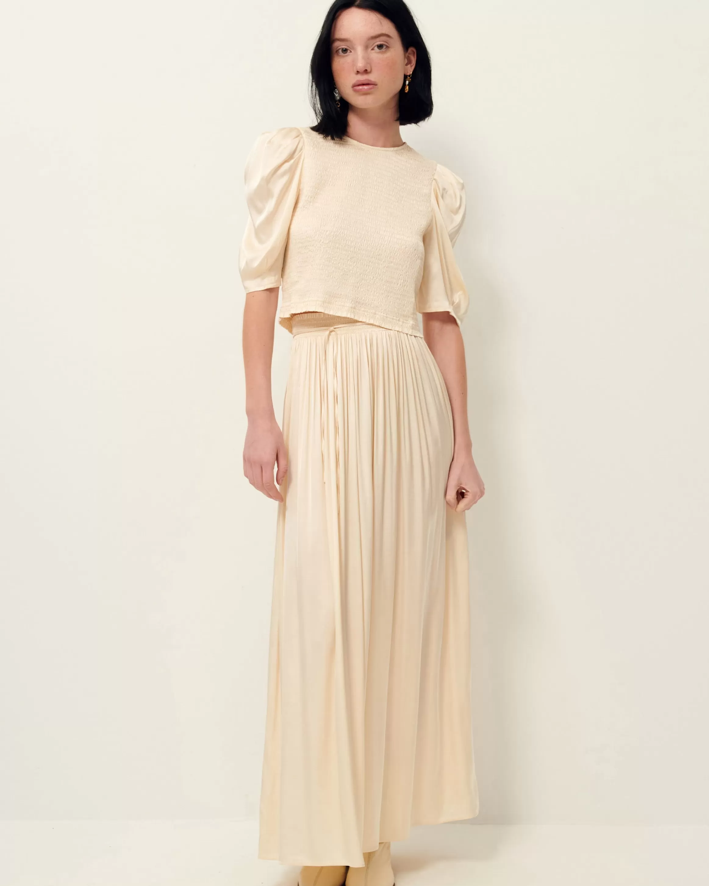 Top court entièrement smocké, manches ballon, en satin fluide.