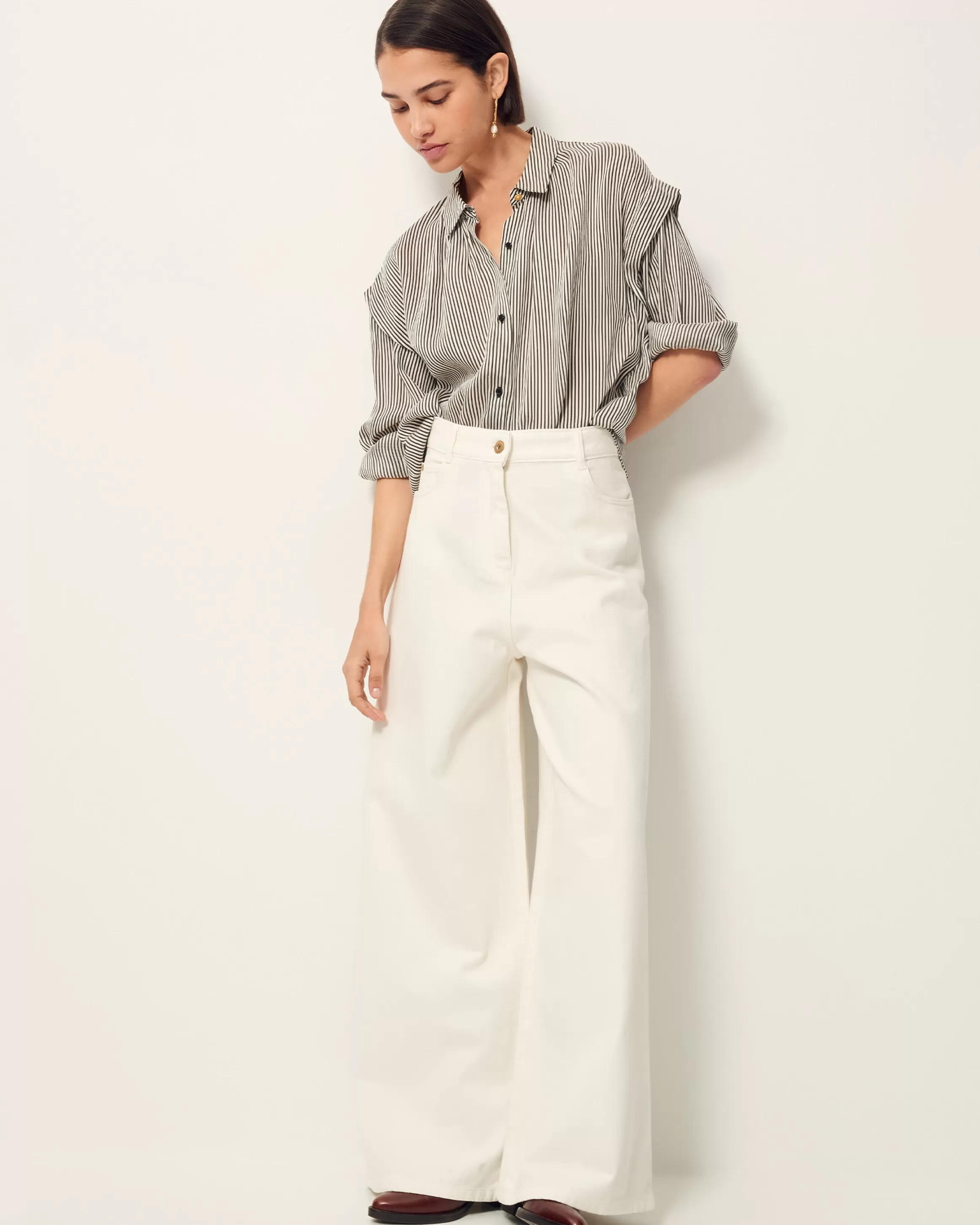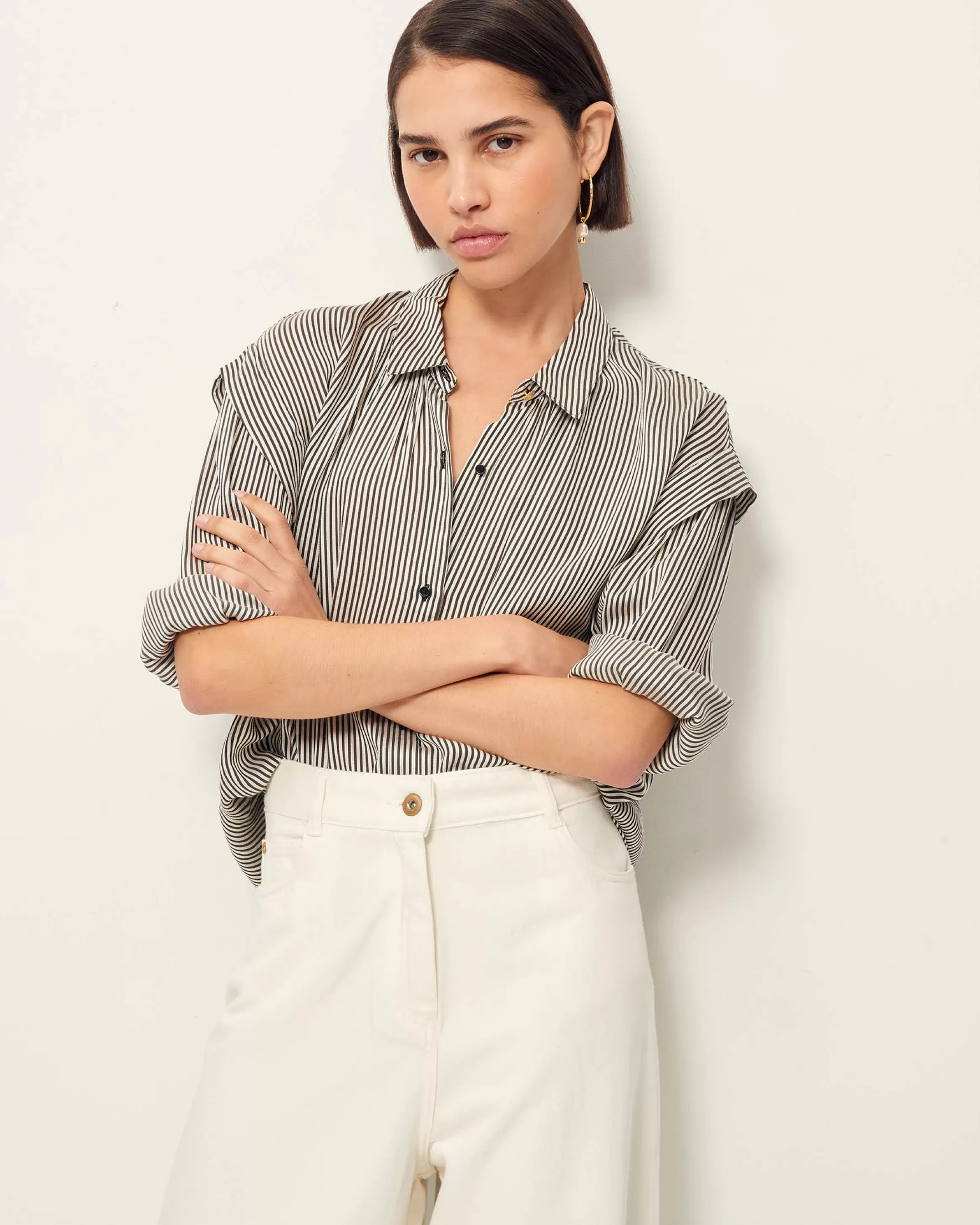 Chemise ample avec détail de pli plat sur les côtés en jacquard dobby de viscose soie rayé bicolore tissé en Italie…