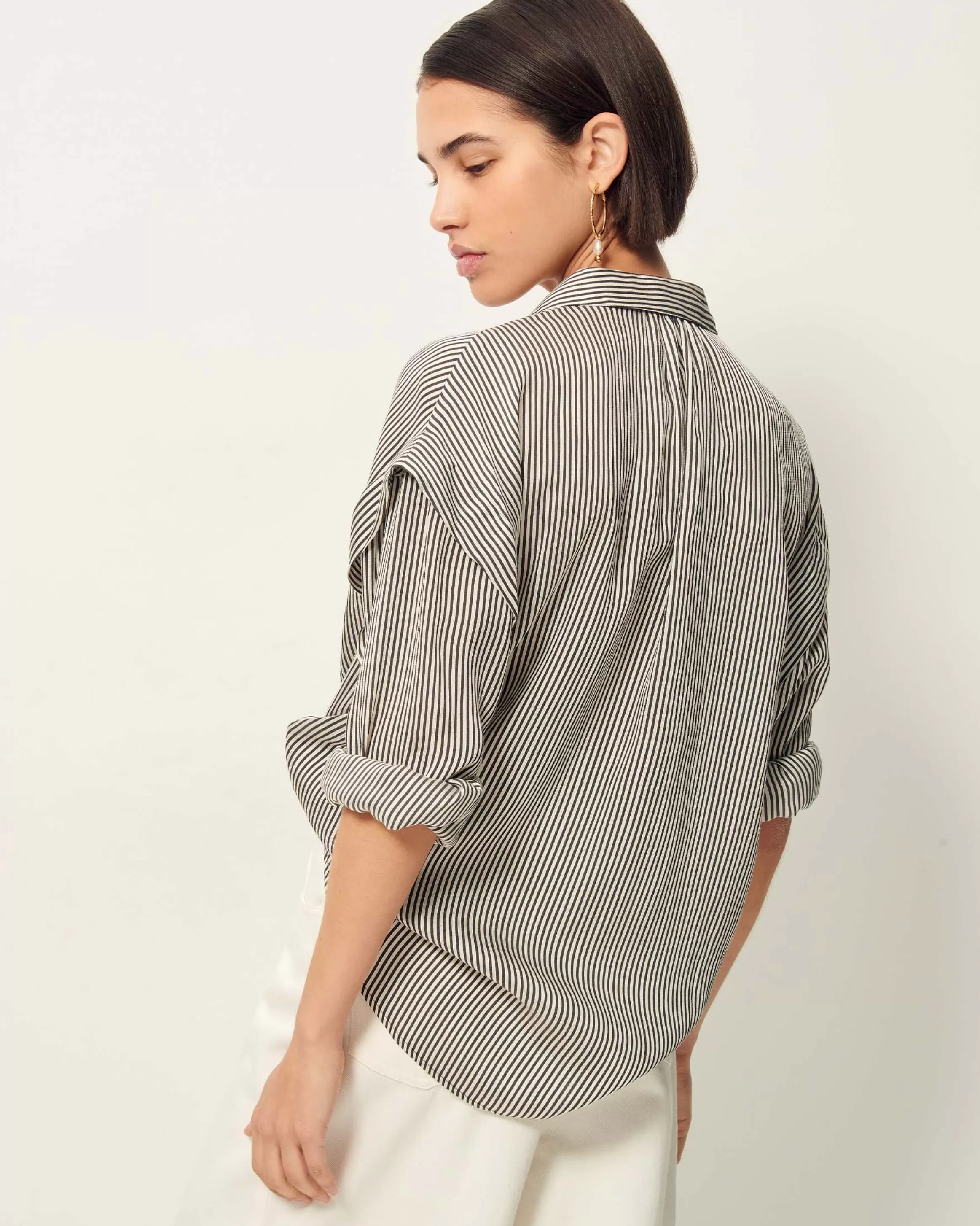 Chemise ample avec détail de pli plat sur les côtés en jacquard dobby de viscose soie rayé bicolore tissé en Italie…