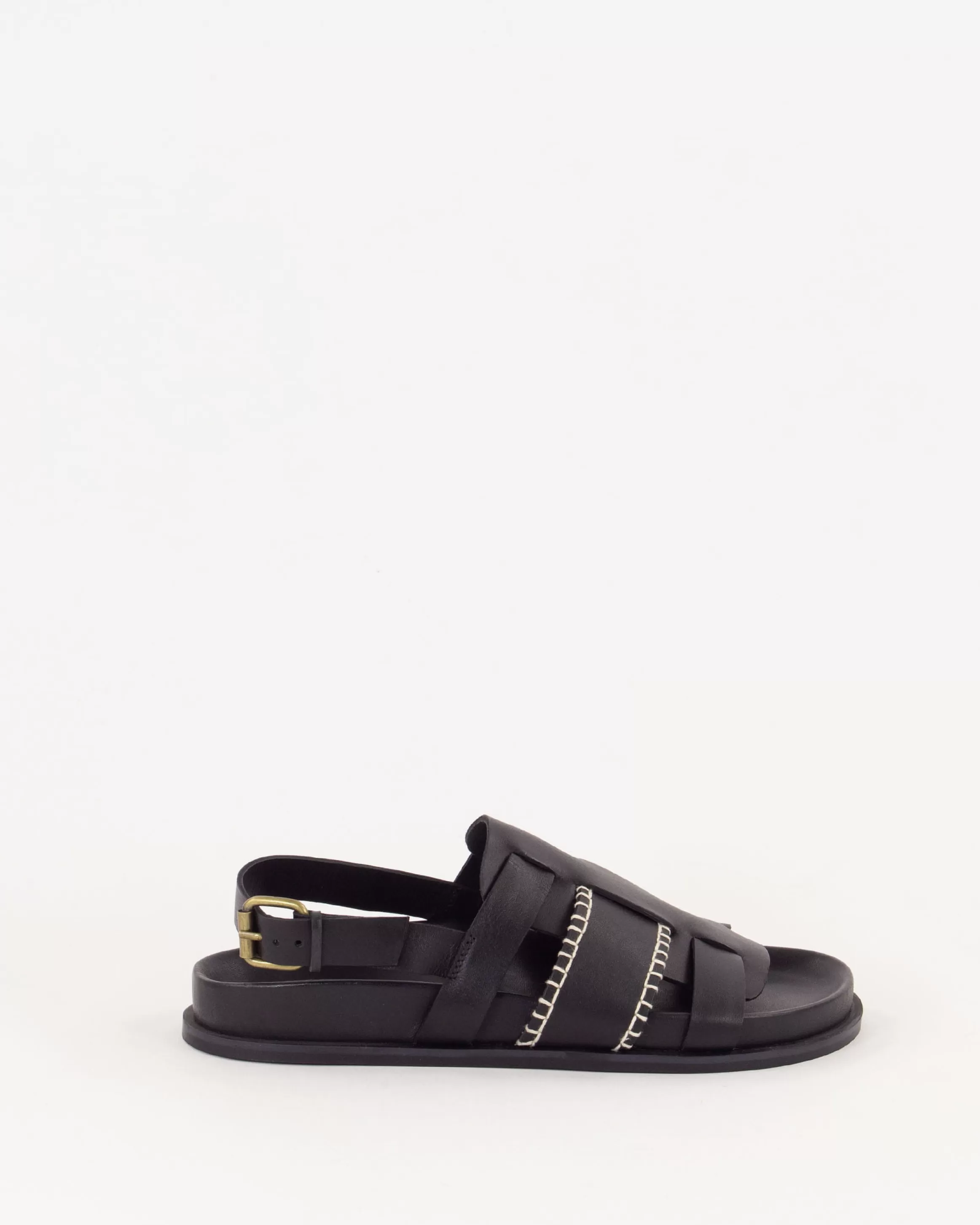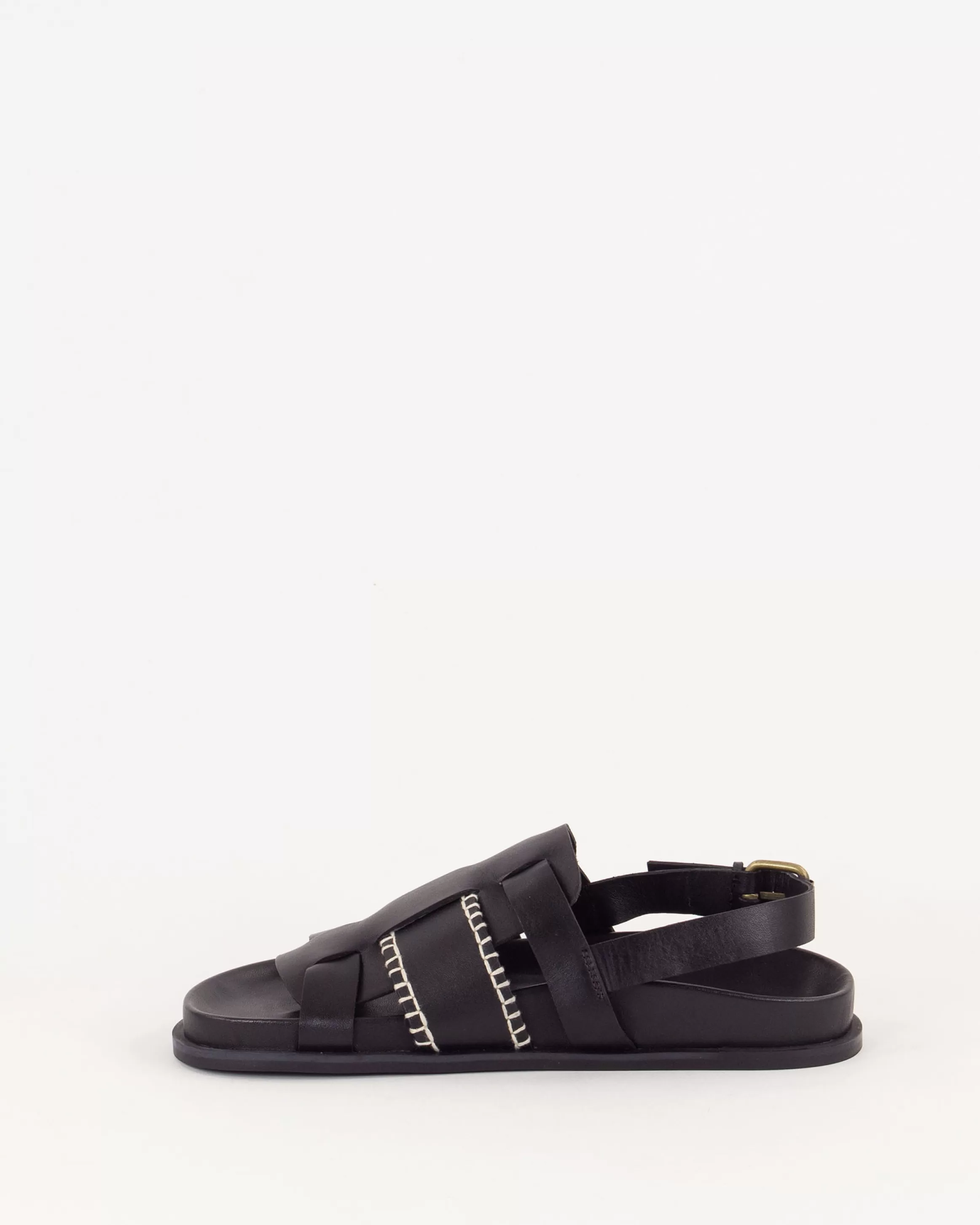 Bride arrière fermée par une boucle en métal doré.