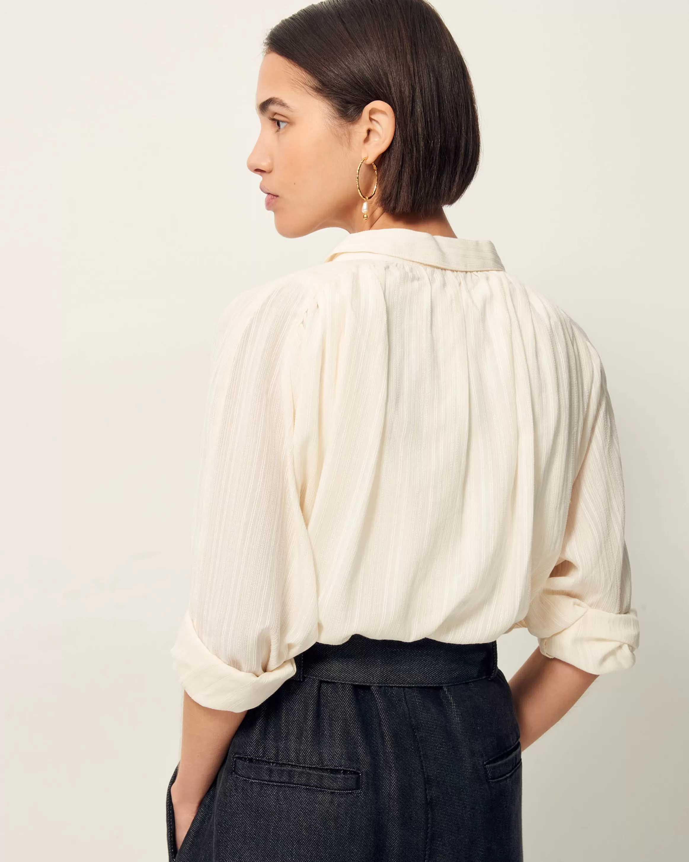 Chemise ample froncée en linon antique à fines rayures jacquard tissé en France, exclusif Sessùn.