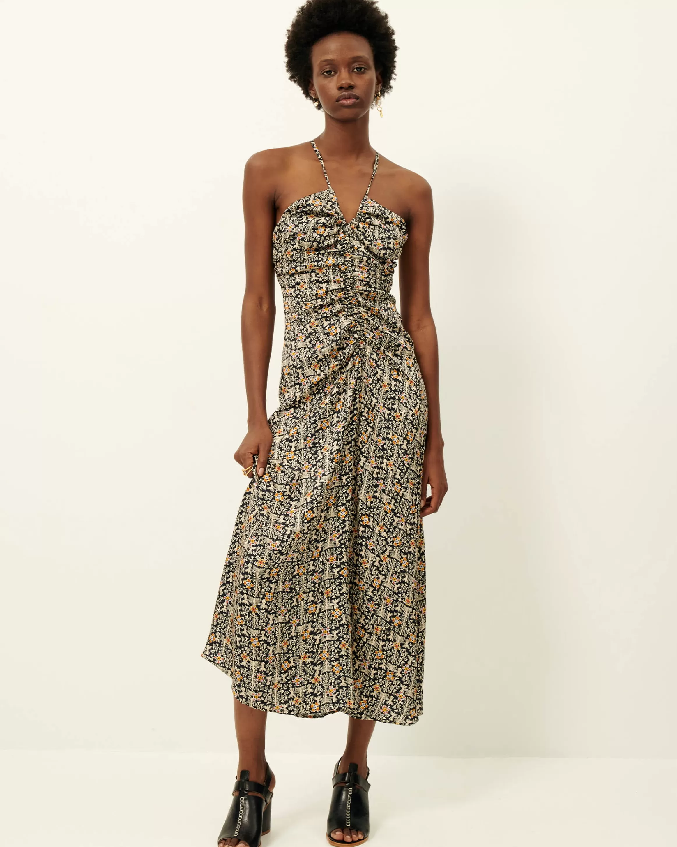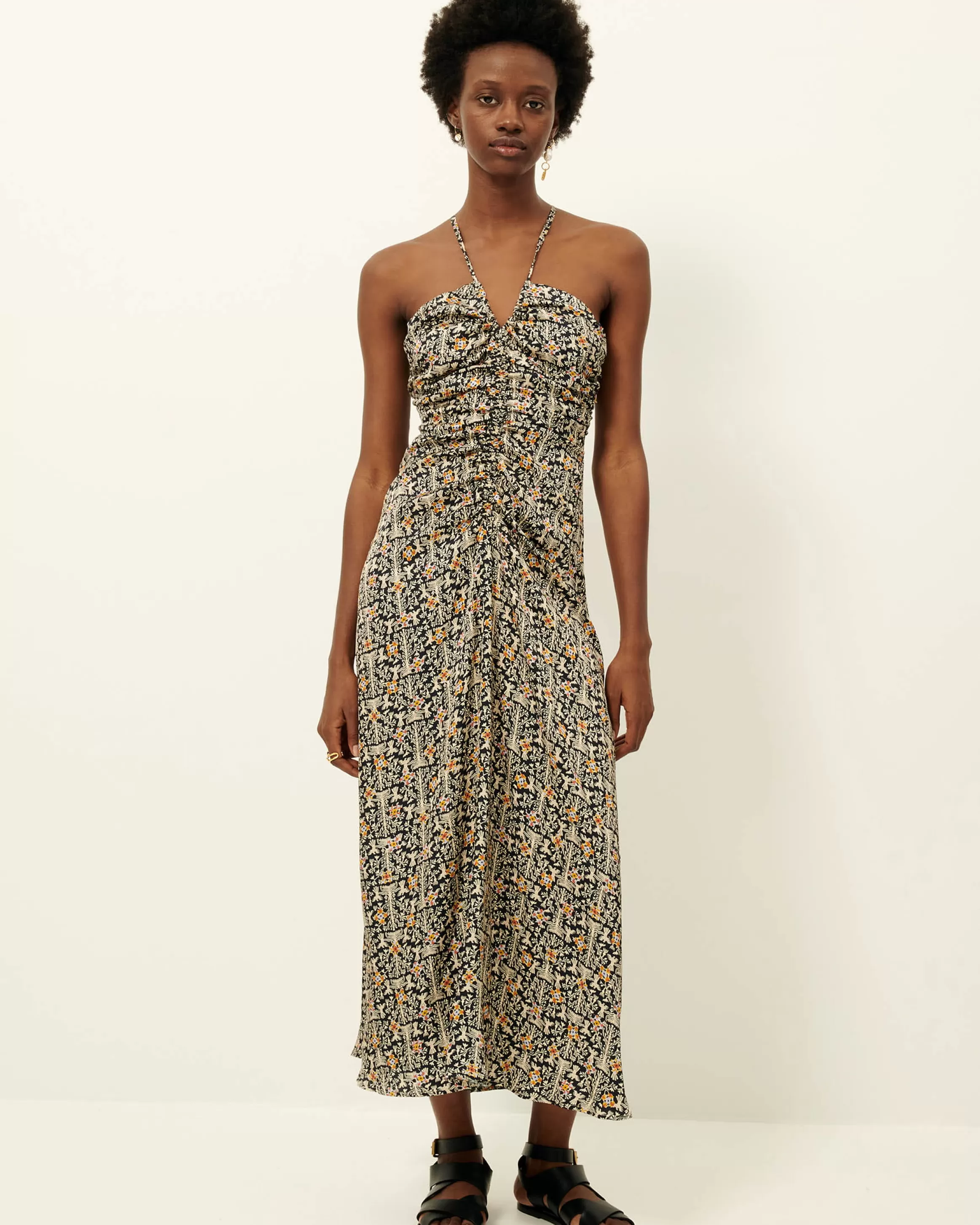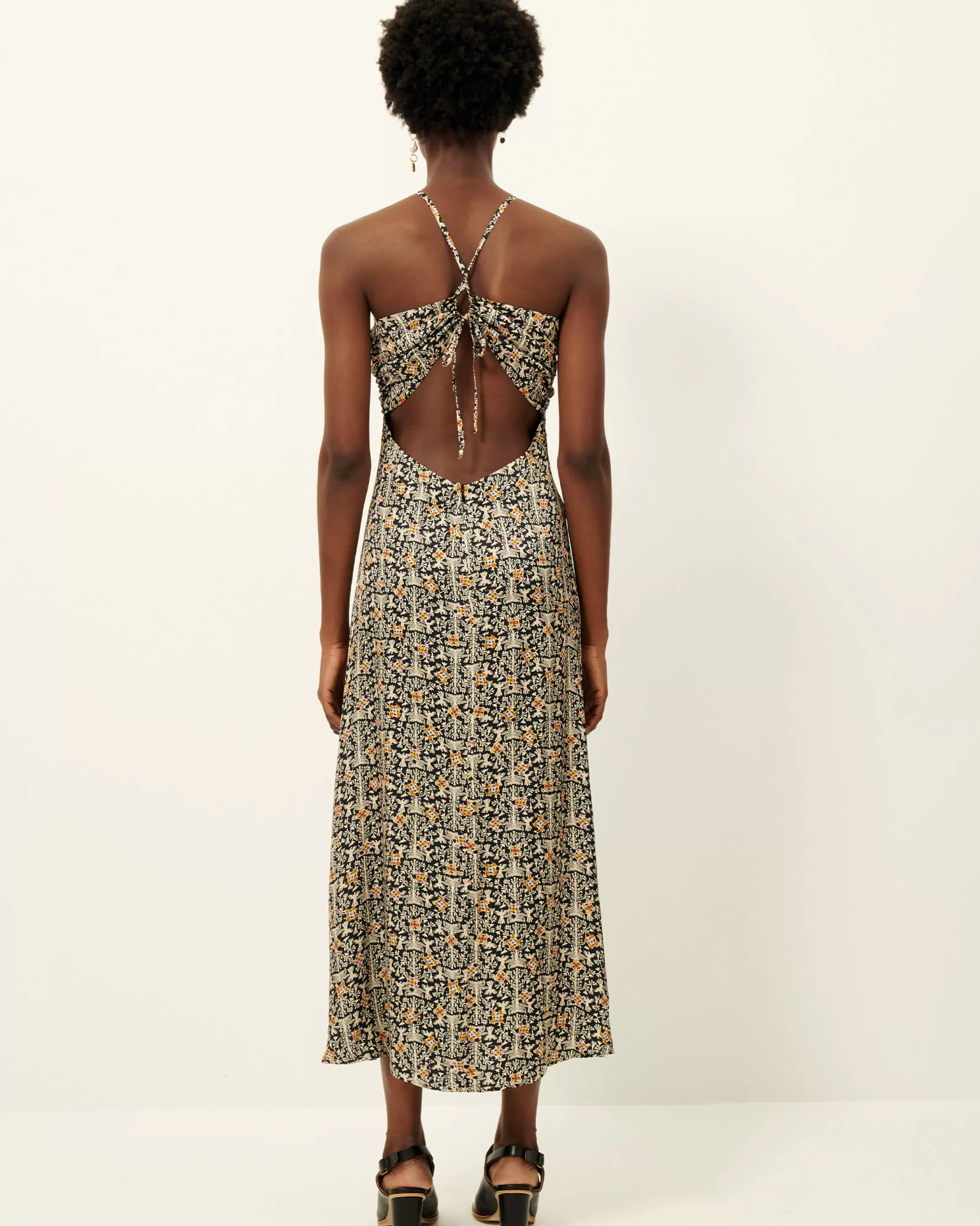 Robe longue ajustée à fines bretelles, dos nu en satin fluide imprimé apprêté en Italie, motif exclusif Sessùn .