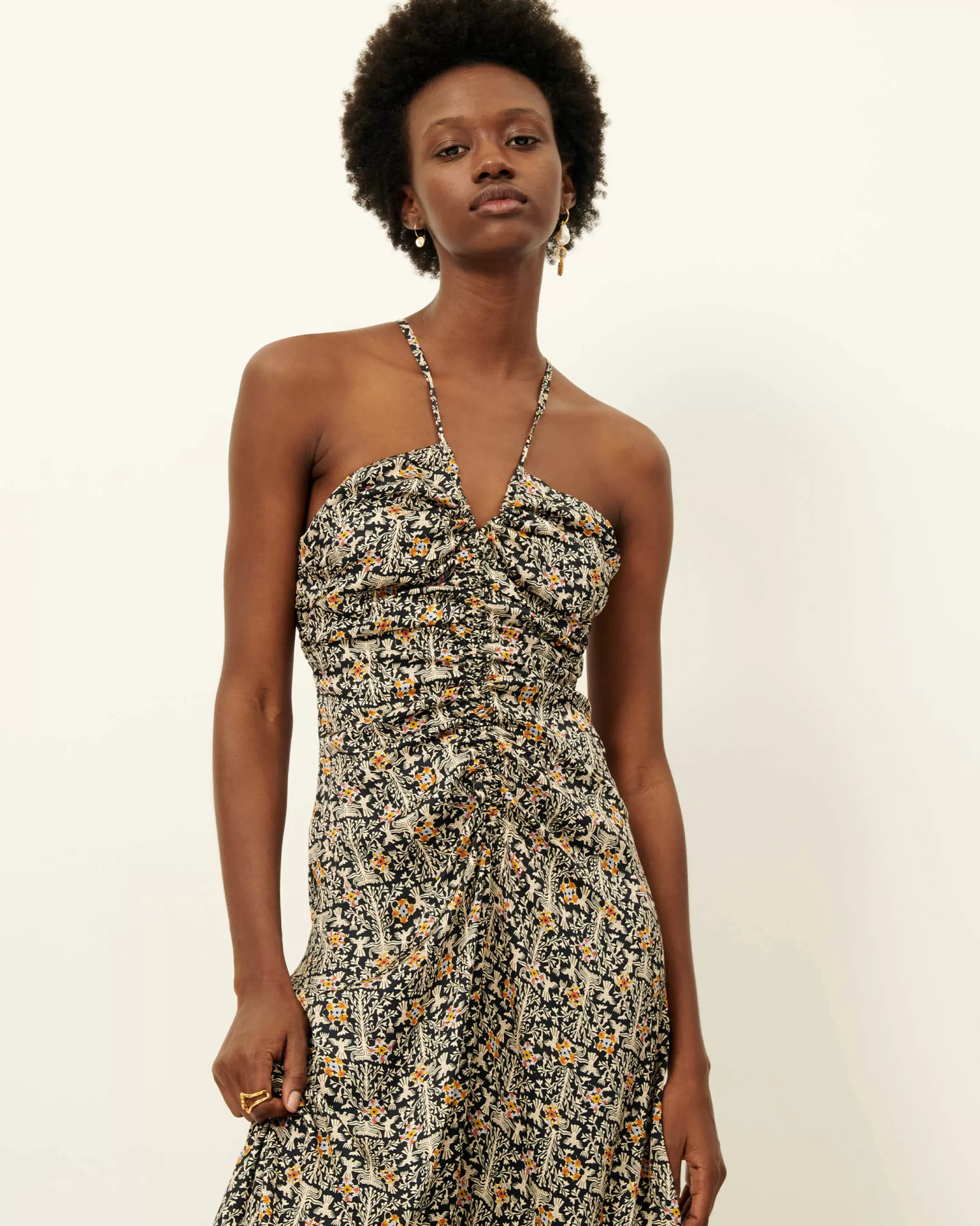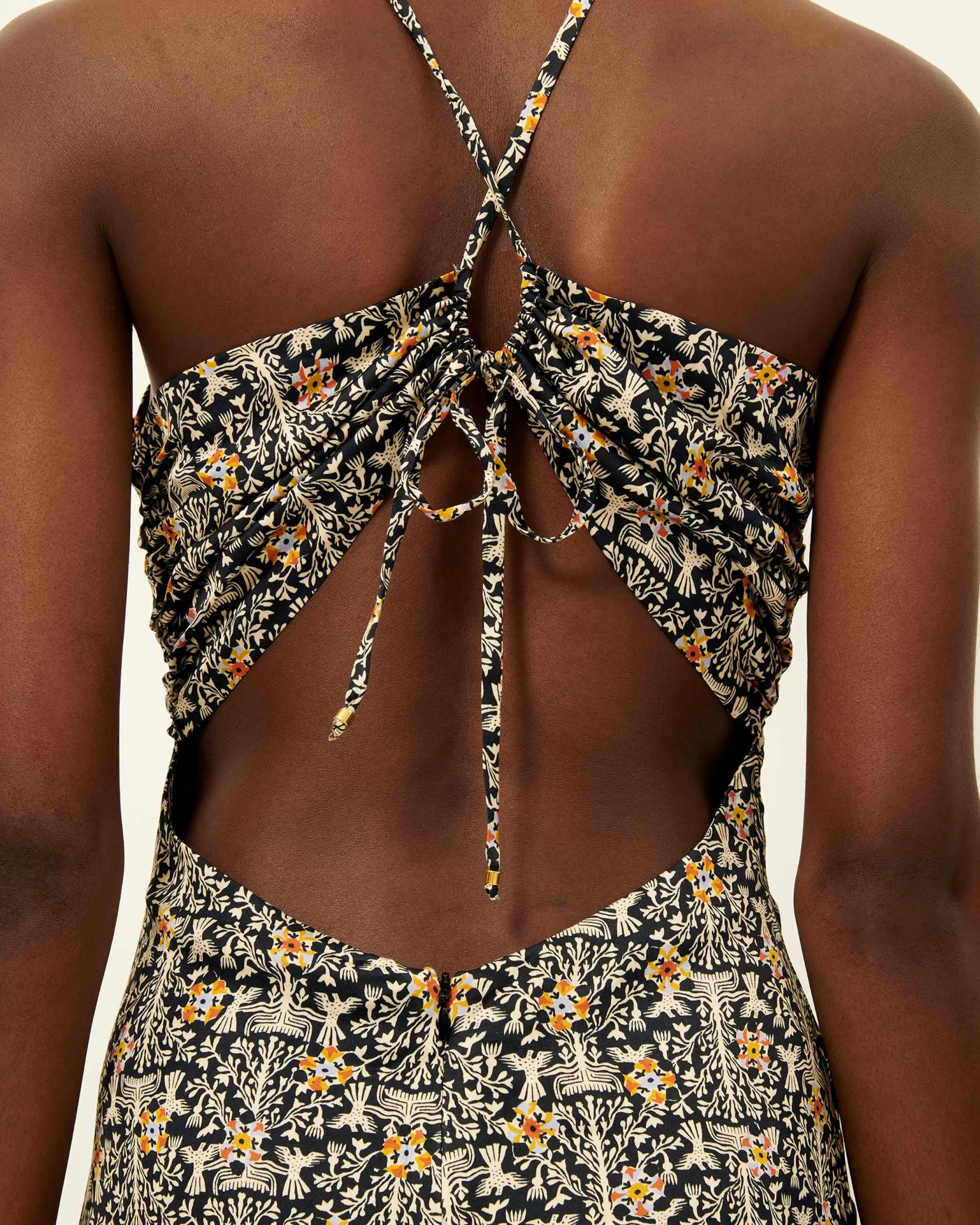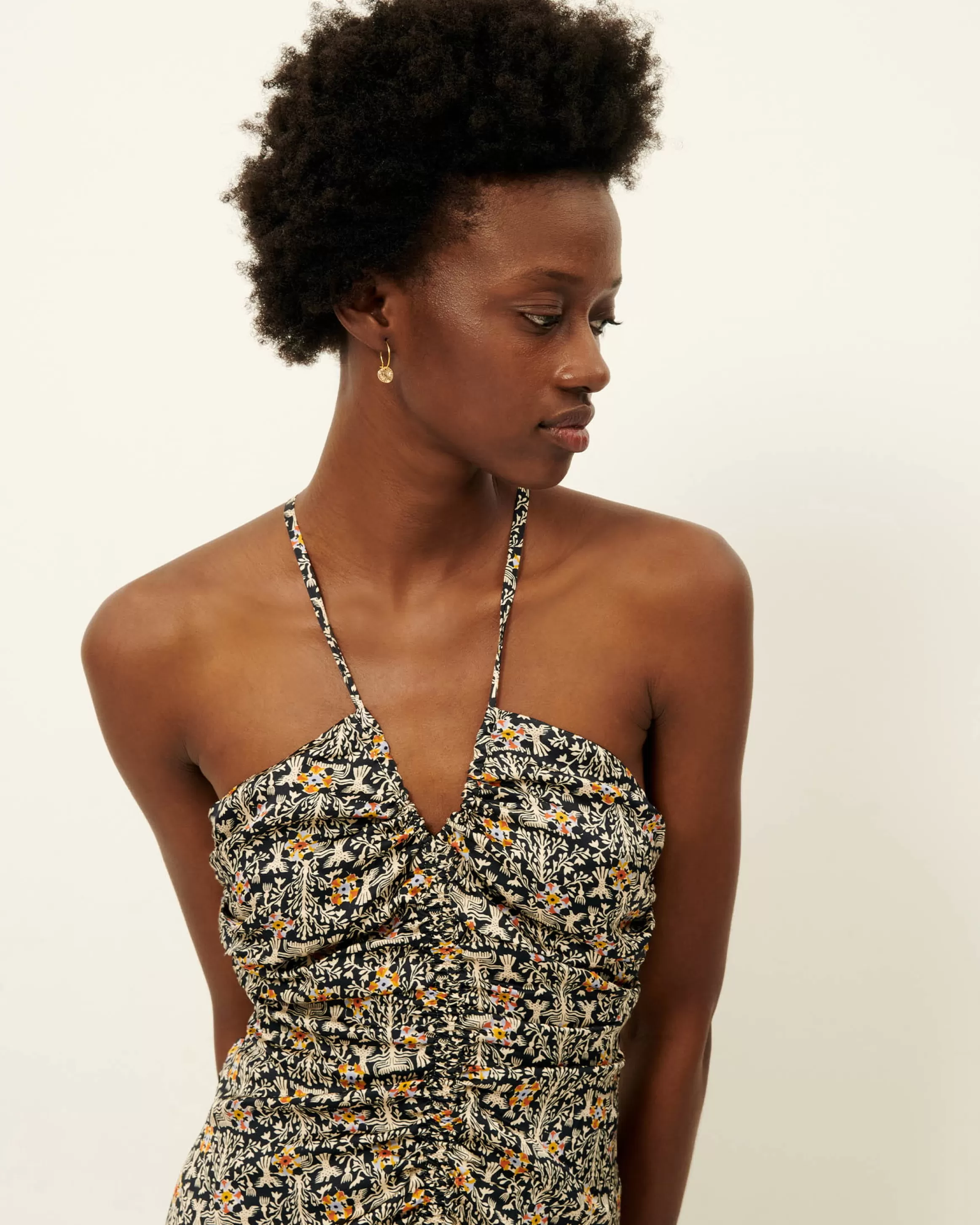 Robe longue ajustée à fines bretelles, dos nu en satin fluide imprimé apprêté en Italie, motif exclusif Sessùn .