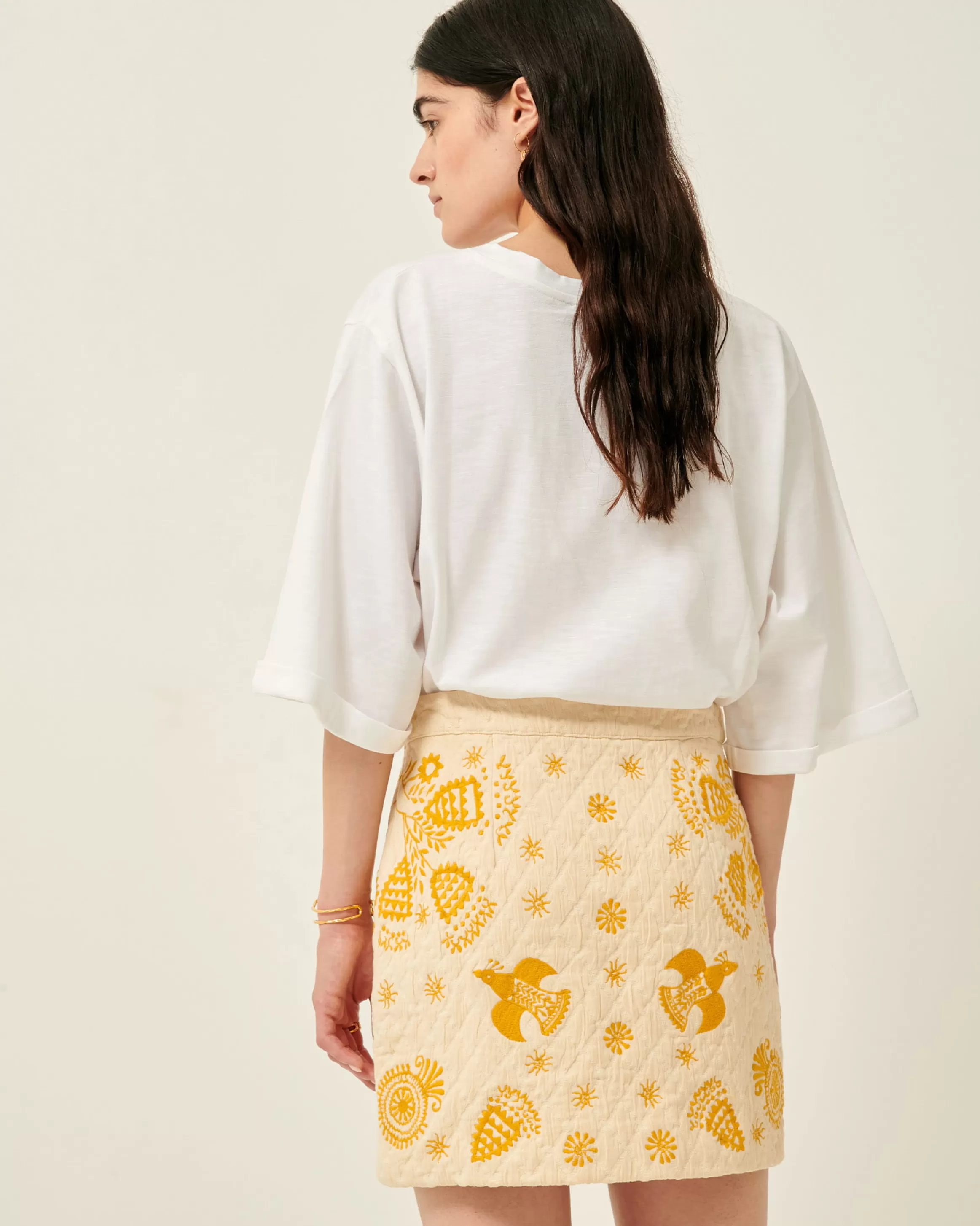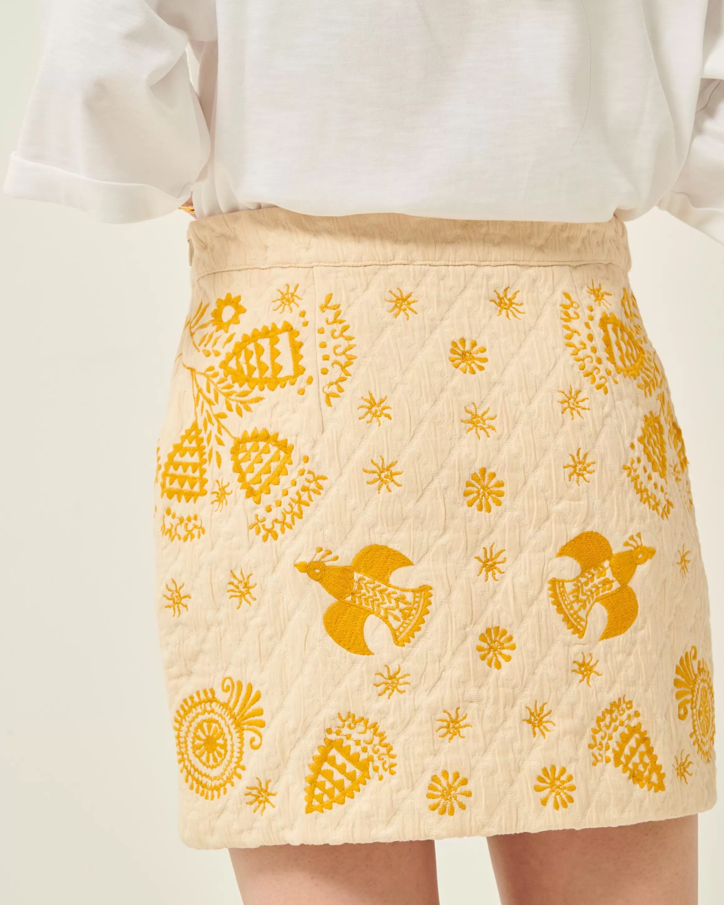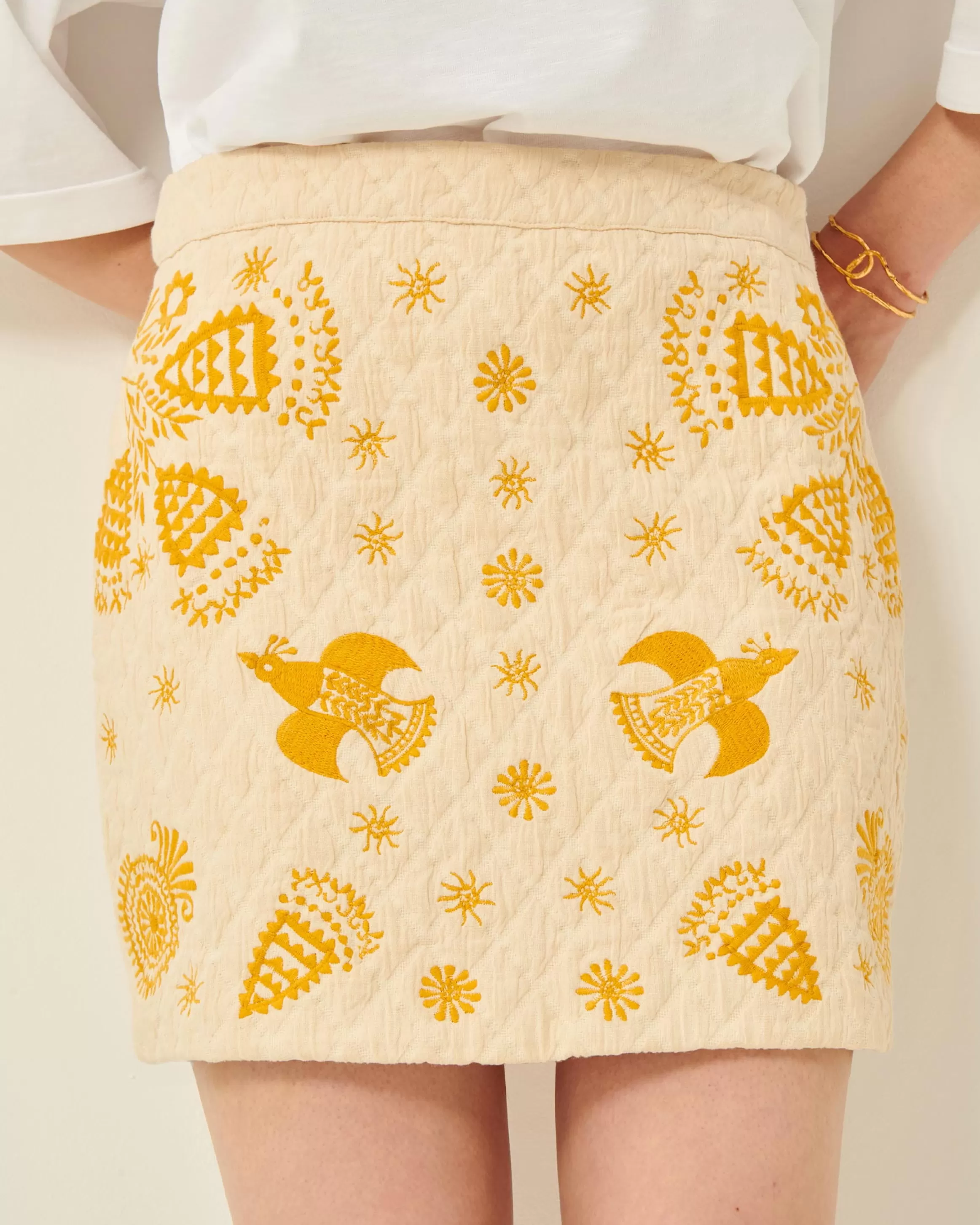 Mini jupe en tissage jacquard armuré effet matelassé, illustrations brodées colorées, motif exclusif Sessùn.