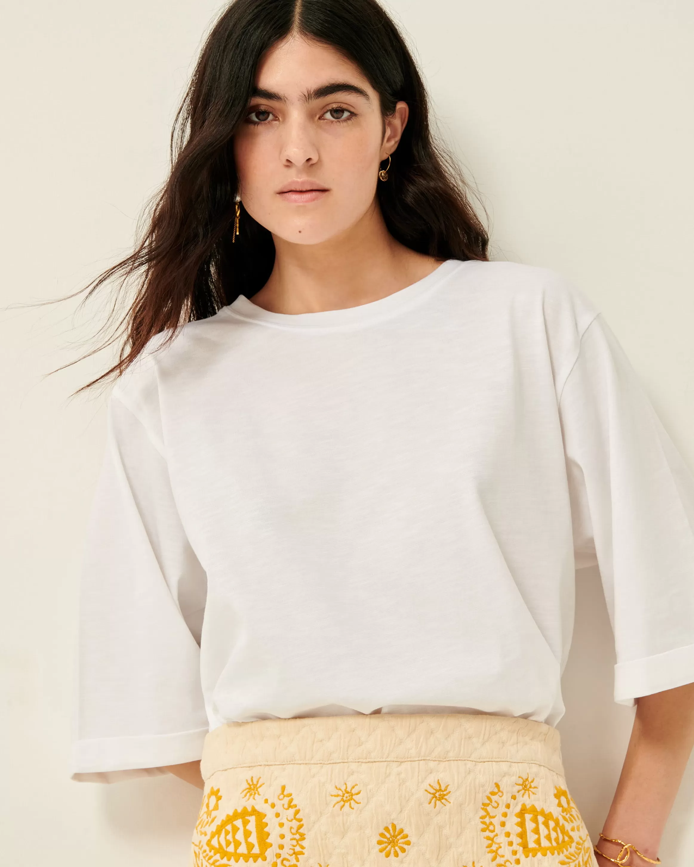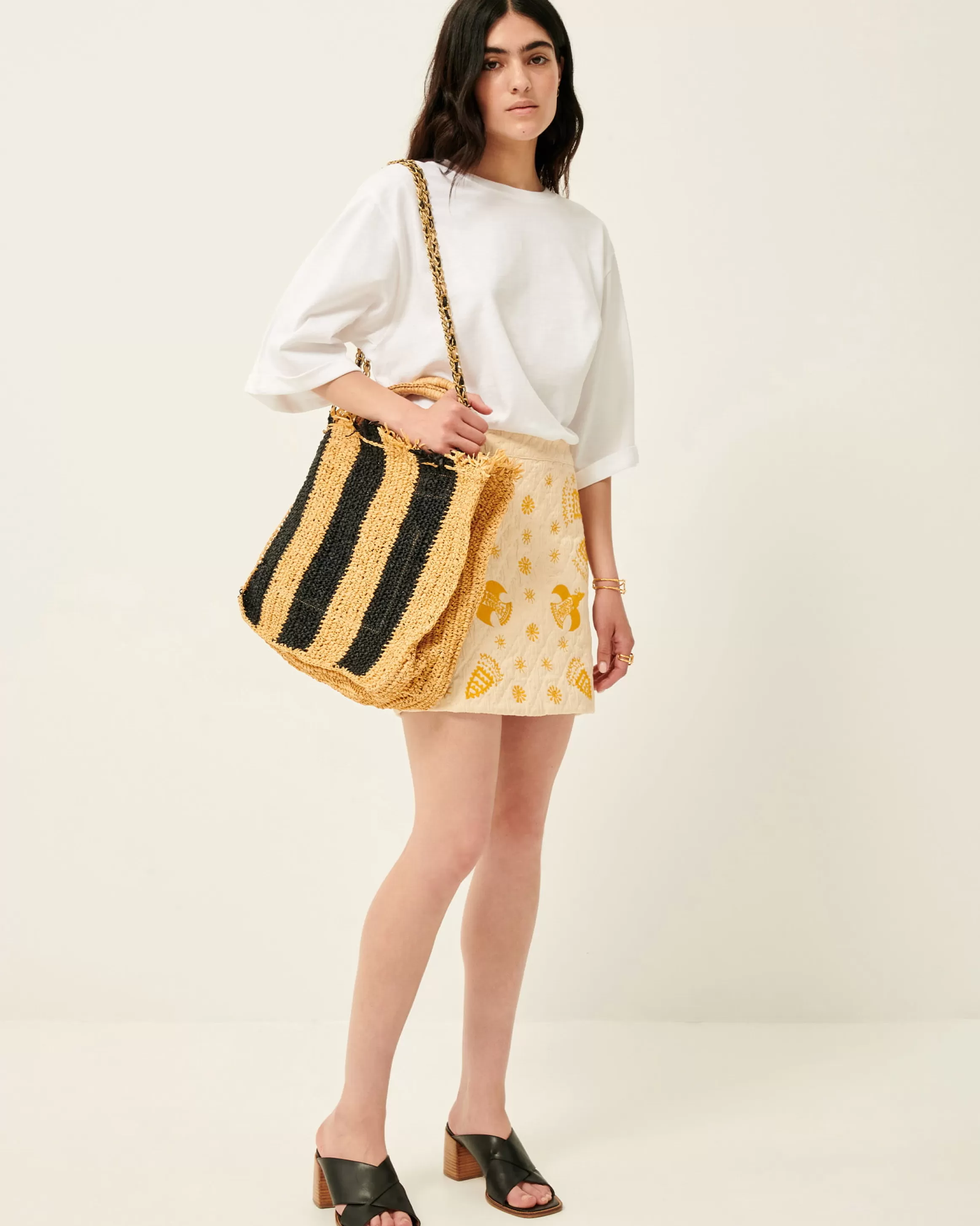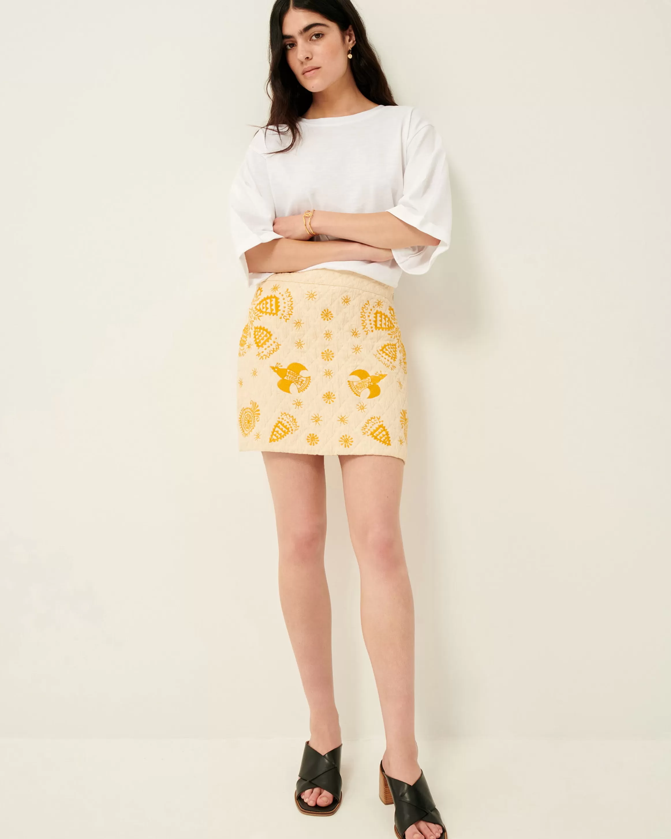 Mini jupe en tissage jacquard armuré effet matelassé, illustrations brodées colorées, motif exclusif Sessùn.